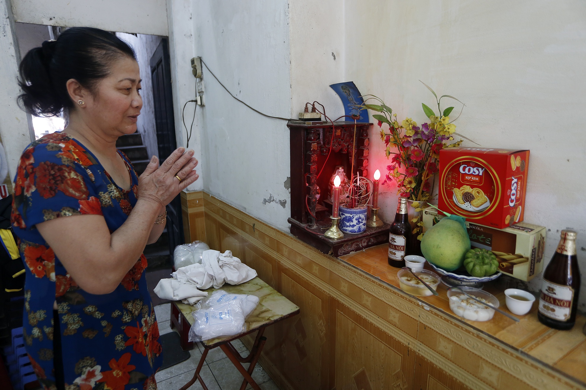 Cô Tuyết (61 tuổi), phố Hàng Điếu sửa soạn và thắp hương cầu thần tài.