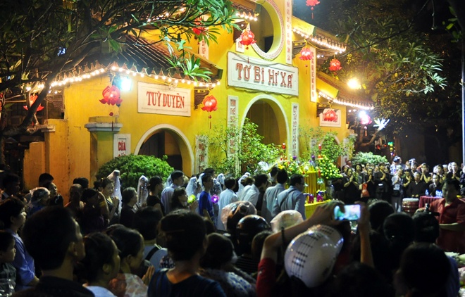 | Đến 7h tối, khu vực chùa Quán Sứ đông nghịt người đến làm lễ, trái ngược với hình ảnh vài người vào cuối giờ chiều. Ảnh: An Hoàng Thành. |