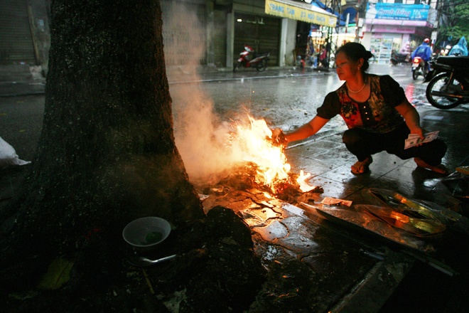 | Dọc các con đường, người dân đốt vàng mã ngay tại vỉa hè. Bà Xuân cho biết, năm nay kinh tế khó khăn nên đồ hàng mã làm lễ không phong phú và nhiều như mọi năm. |