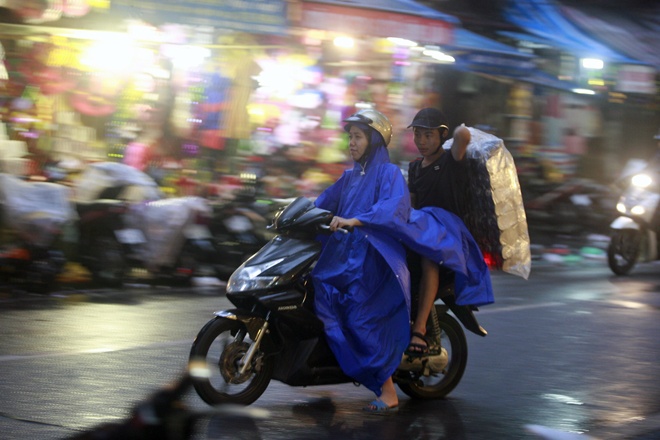 7h tối, mặc dù trời mưa nặng hạt nhưng trên Hàng Mã vẫn có người đi mua đồ. |