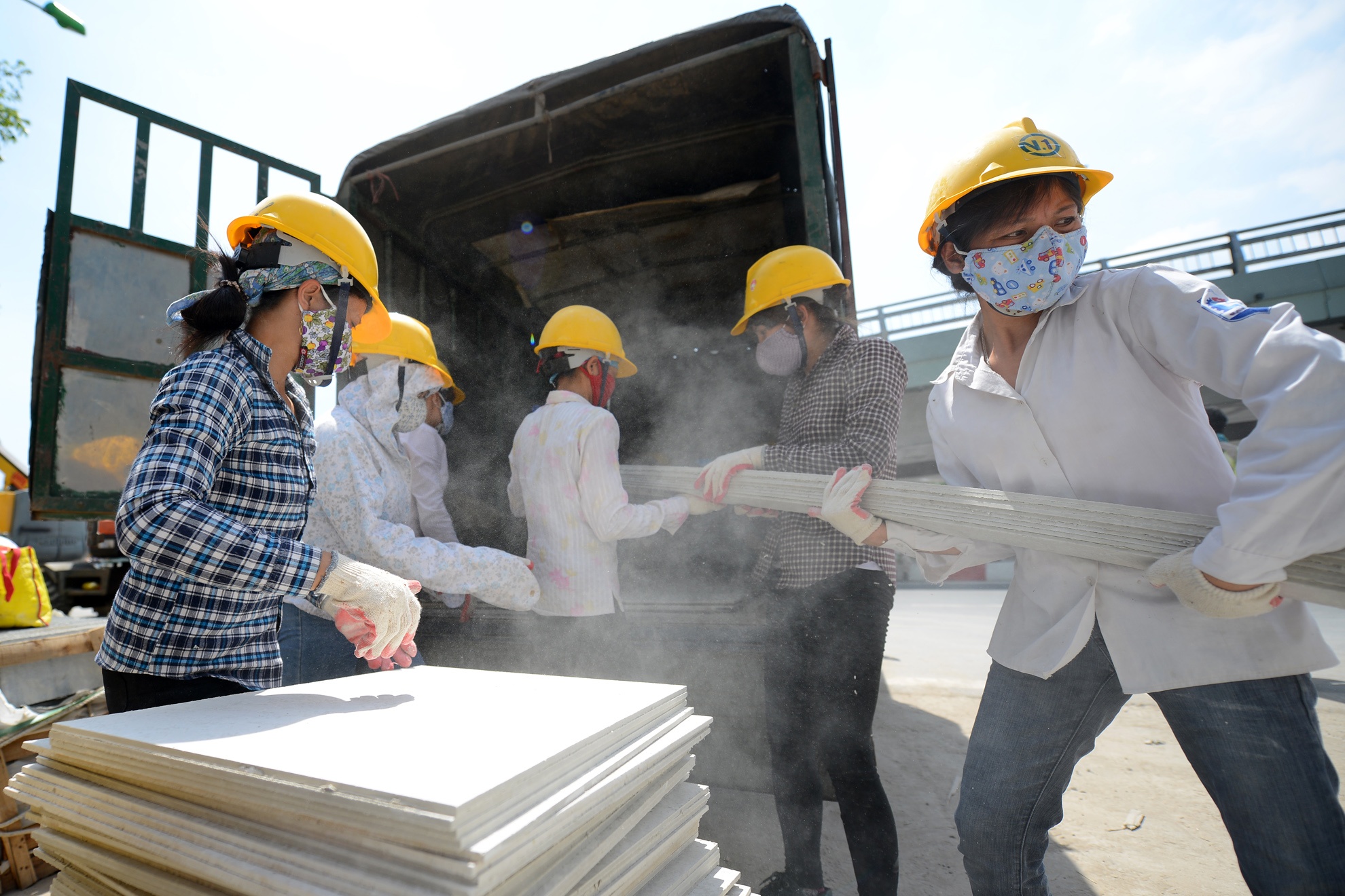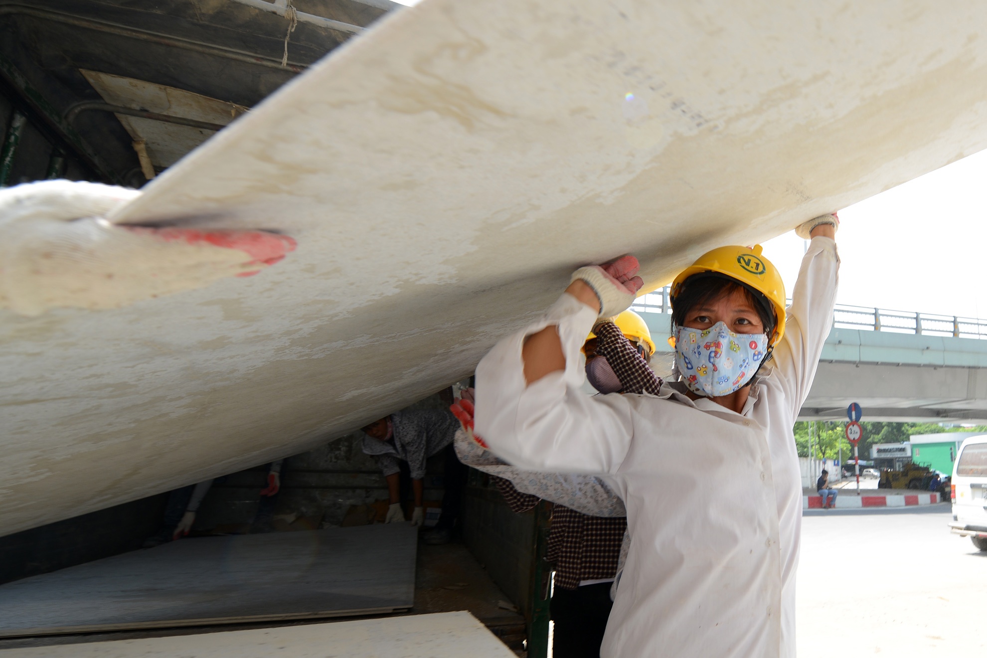 Dưới cái nắng nóng gay gắt, các nữ công nhân tại một công trường lớn giữa nội thành đang khẩn trương bốc xếp hàng hóa vào bãi.