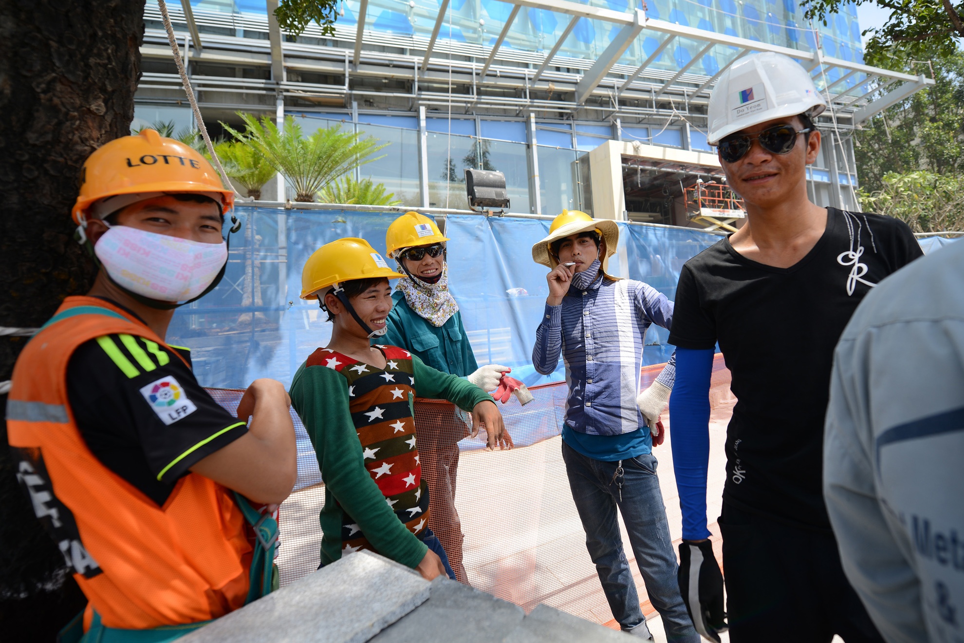 Dưới cái nóng oi bức của Hà Nội, ngoài các thiết bị bảo hộ cần thiết thì các nam công nhân cũng phải trang bị cho mình kín mít để tránh nắng.
