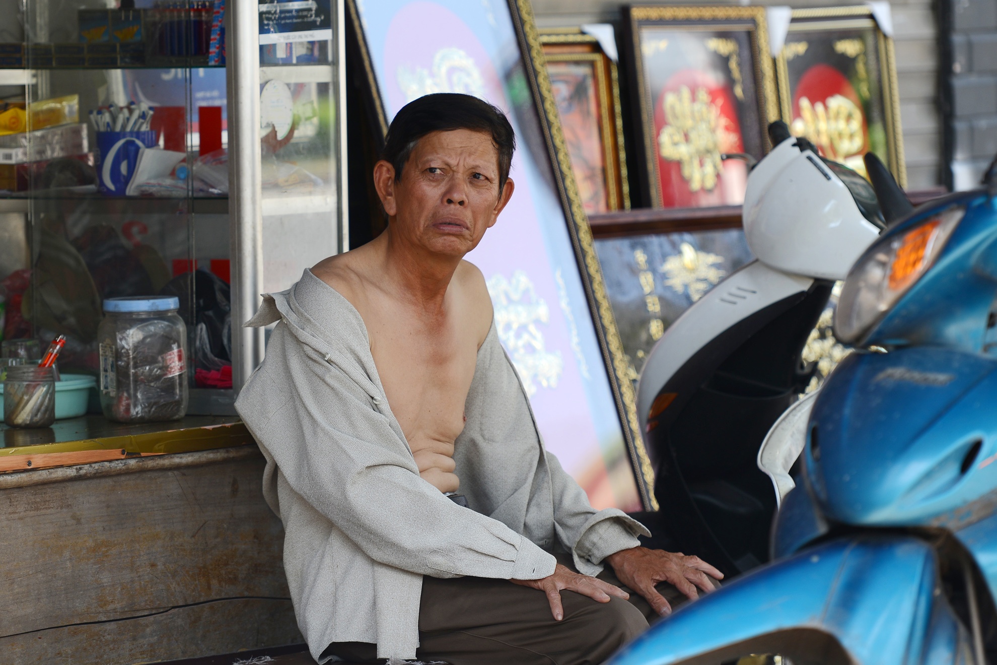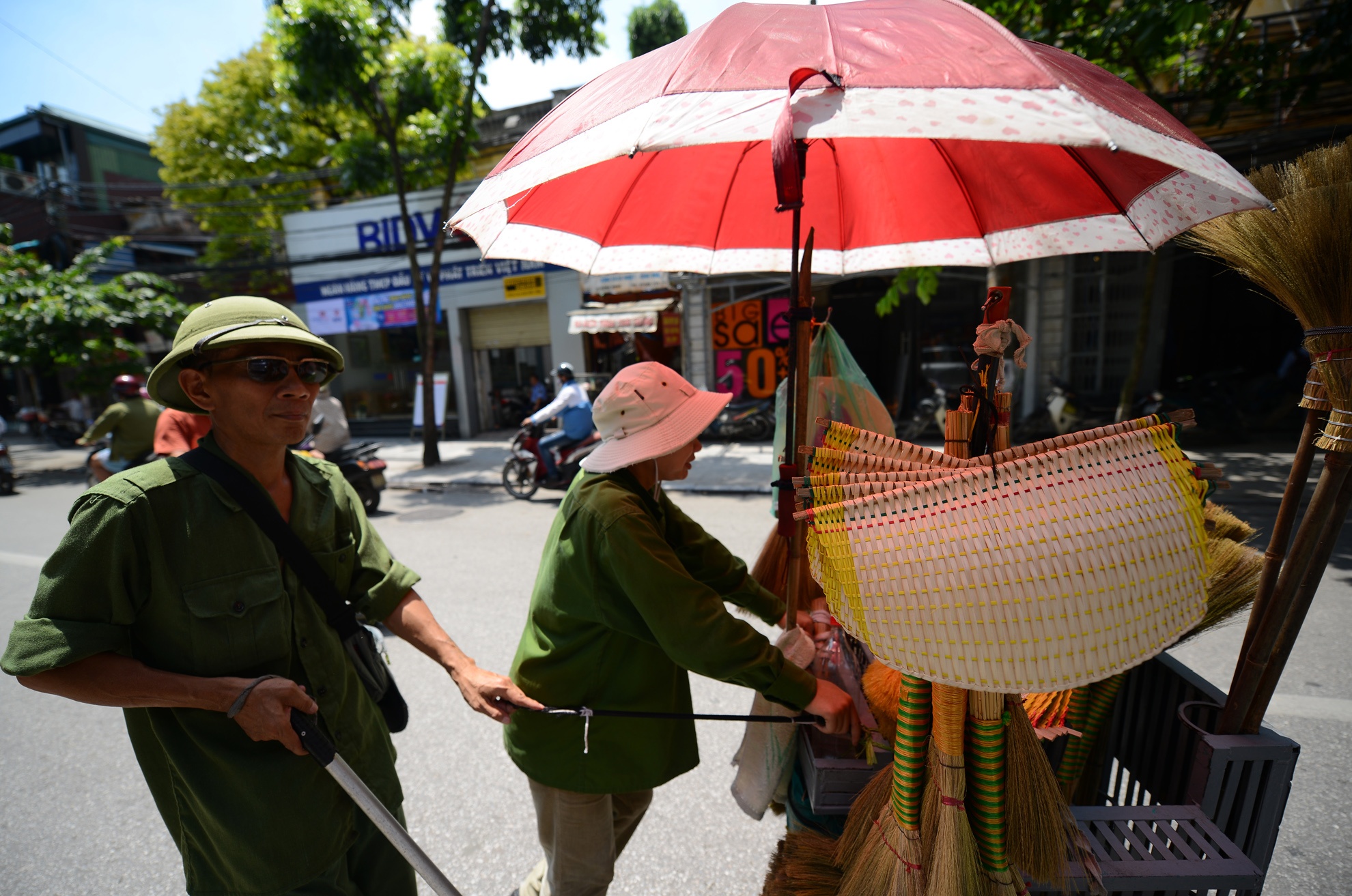 Người tàn tật bán dạo trên phố đã "độ" thêm một chiếc ô lớn trên quầy hàng để che nắng trên suốt chặng đường lang thang trên phố.
