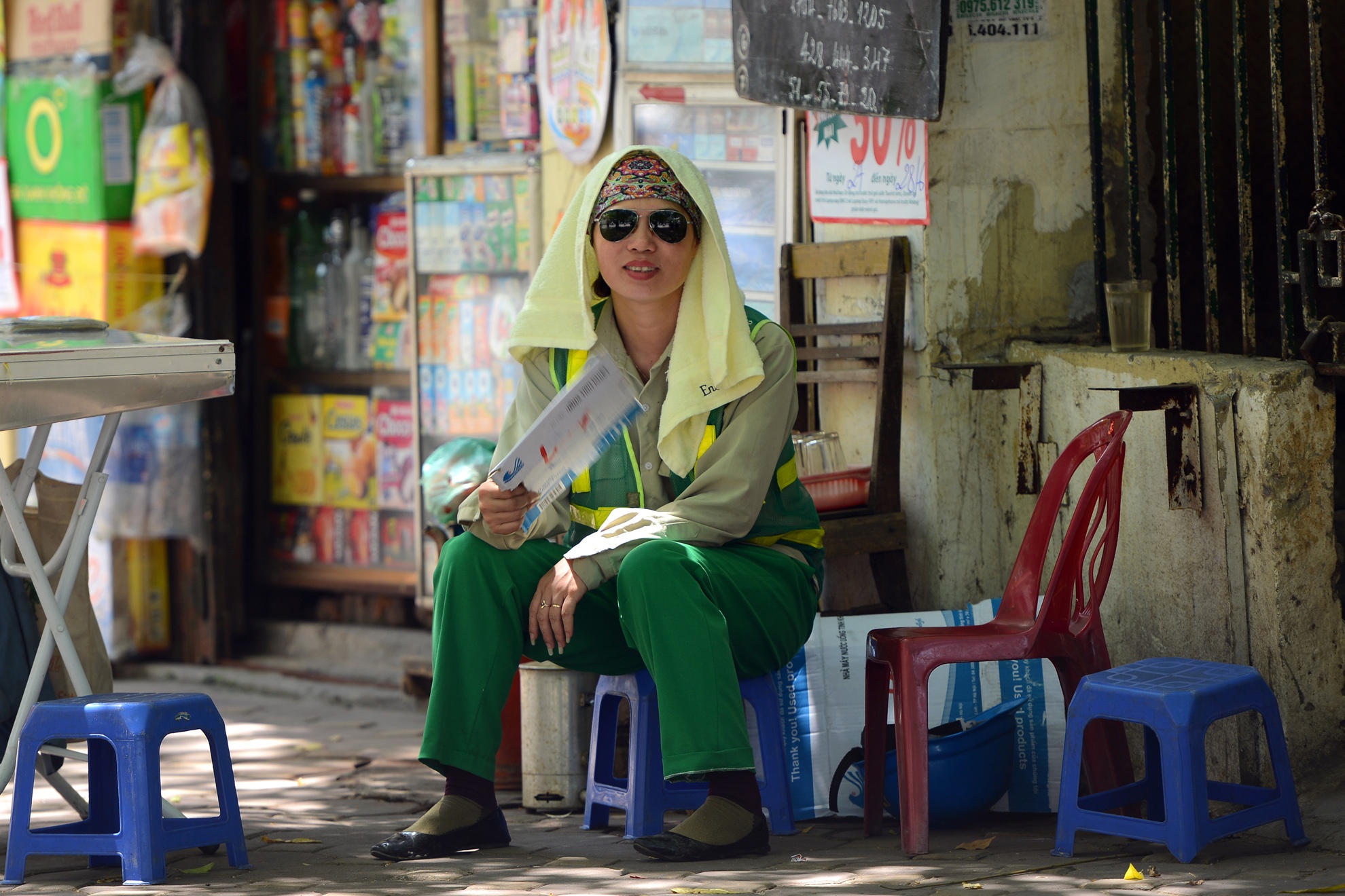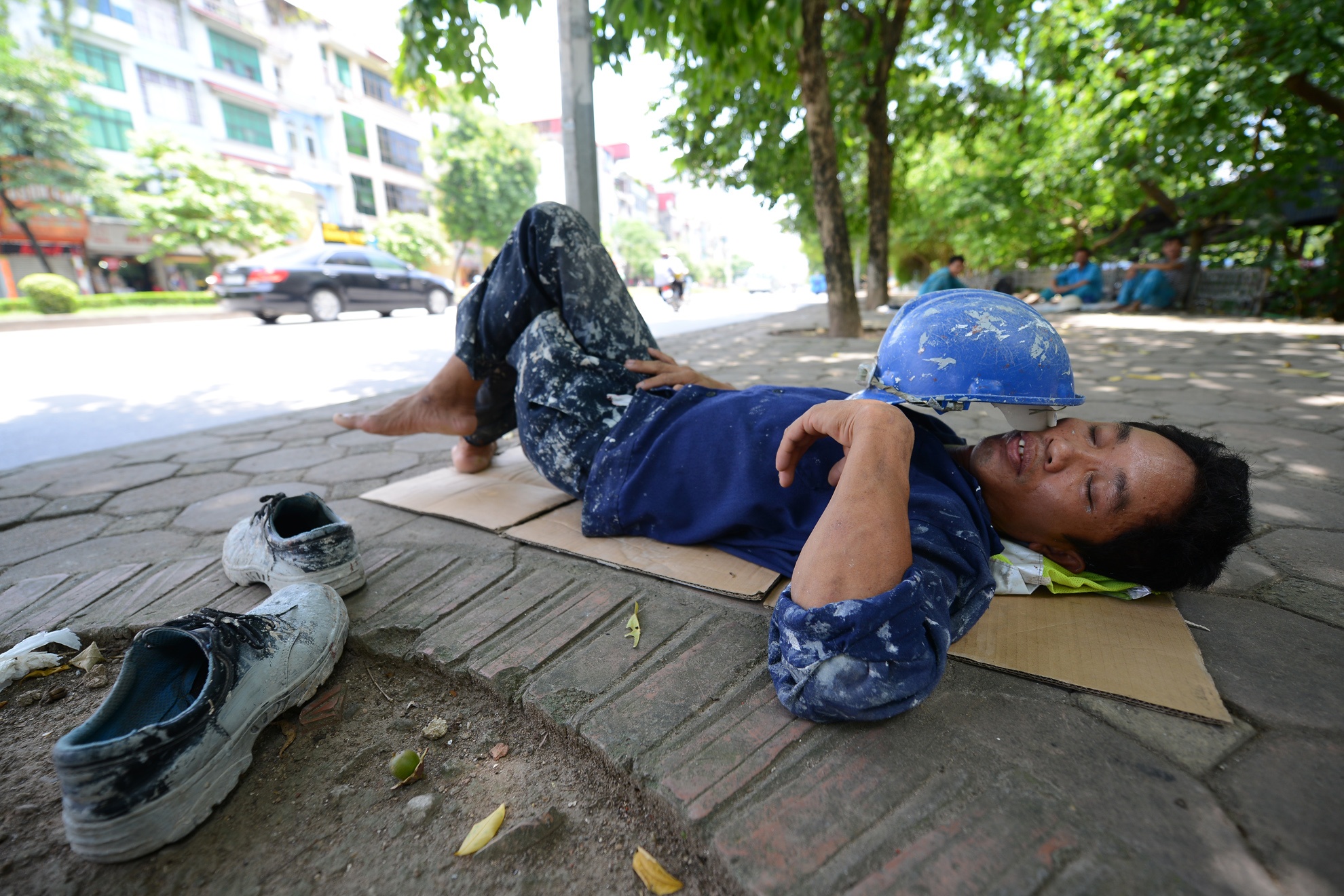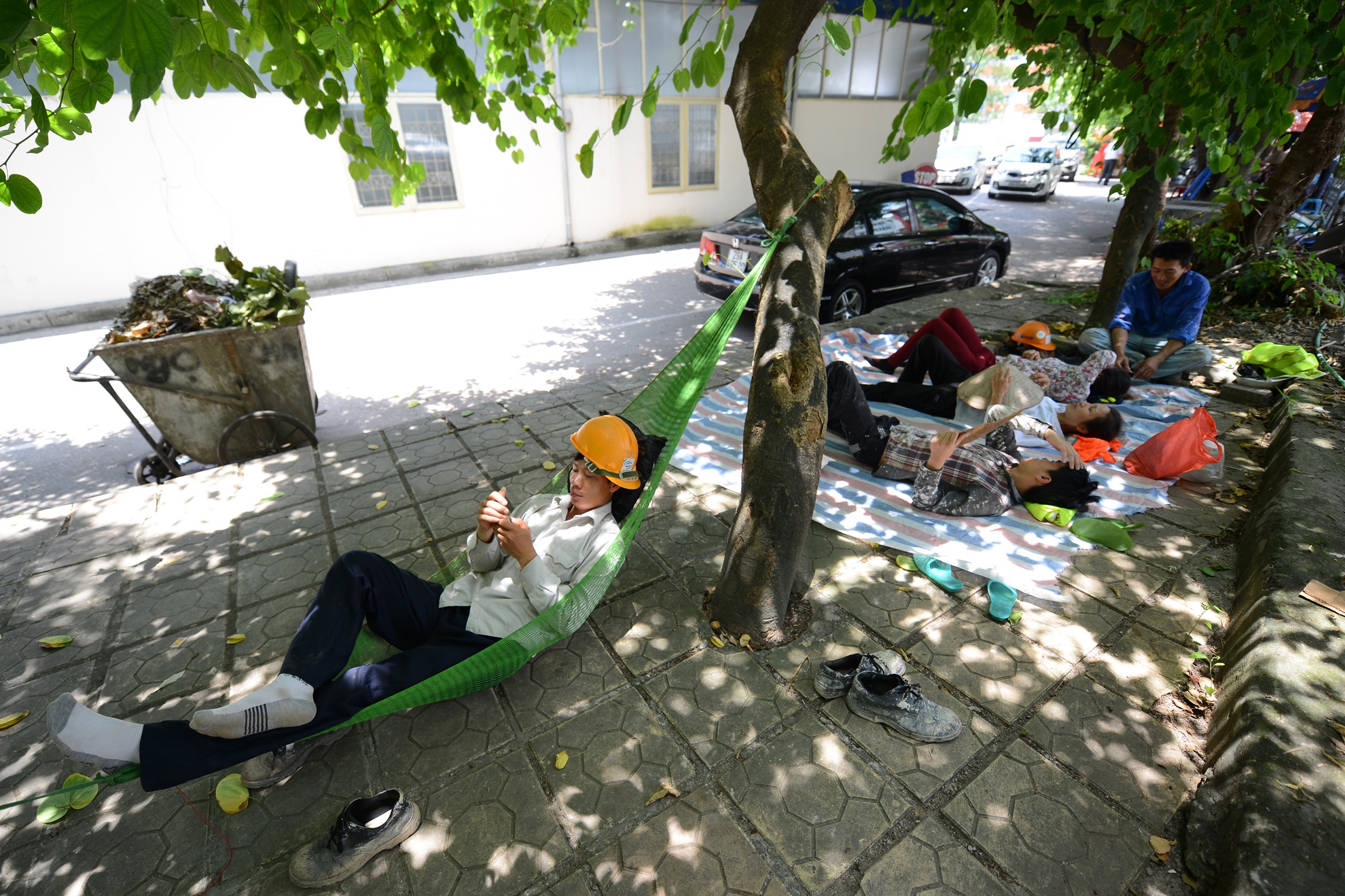 Hứng chịu cái nóng lên tới 40 độ C, người dân Hà Nội trong đó có nhiều lao động nữ do phải vất vả làm việc dưới nắng gắt đã vội vàng tìm bóng mát kiếm vài phút nghỉ ngơi.