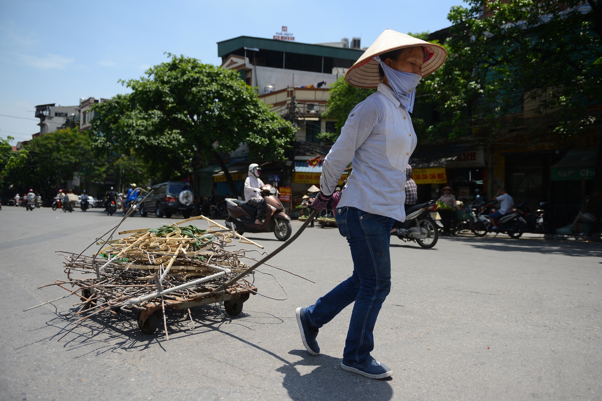 | Một phụ nữ làm nghề thu mua phế liệu kéo xe hàng dưới cái nắng giữa trưa hè. |