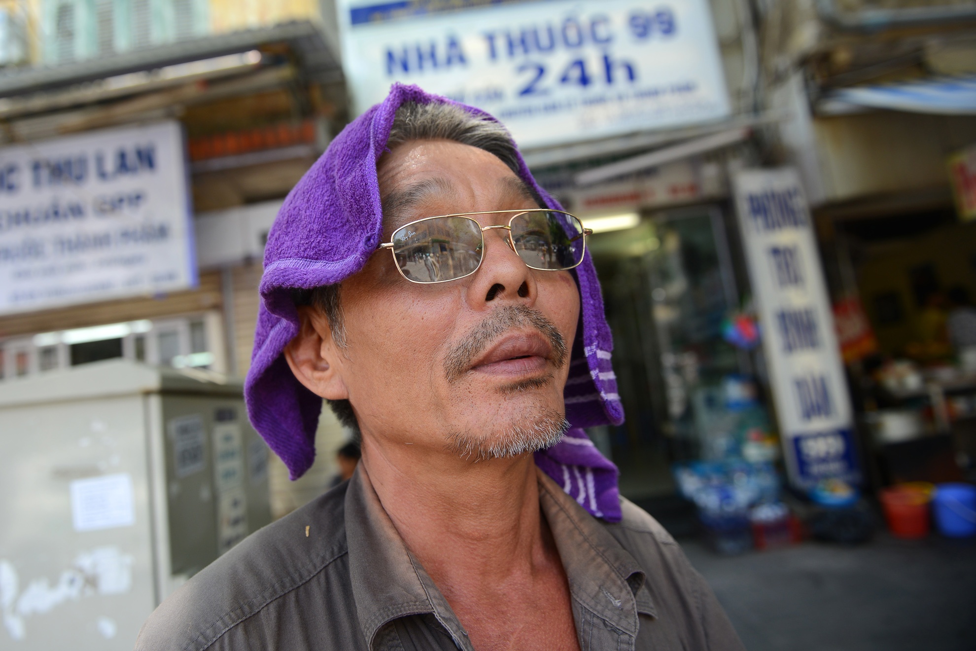 | Trên hè phố, các công nhân vệ sinh vẫn cần mẫn quét dọn vệ sinh, ngoài quần áo bảo hộ còn có thêm lớp khăn quàng kín mặt. Giờ nghỉ trưa hiếm hoi của họ chỉ là quán nước vỉa hè với miếng bìa làm quạt. |