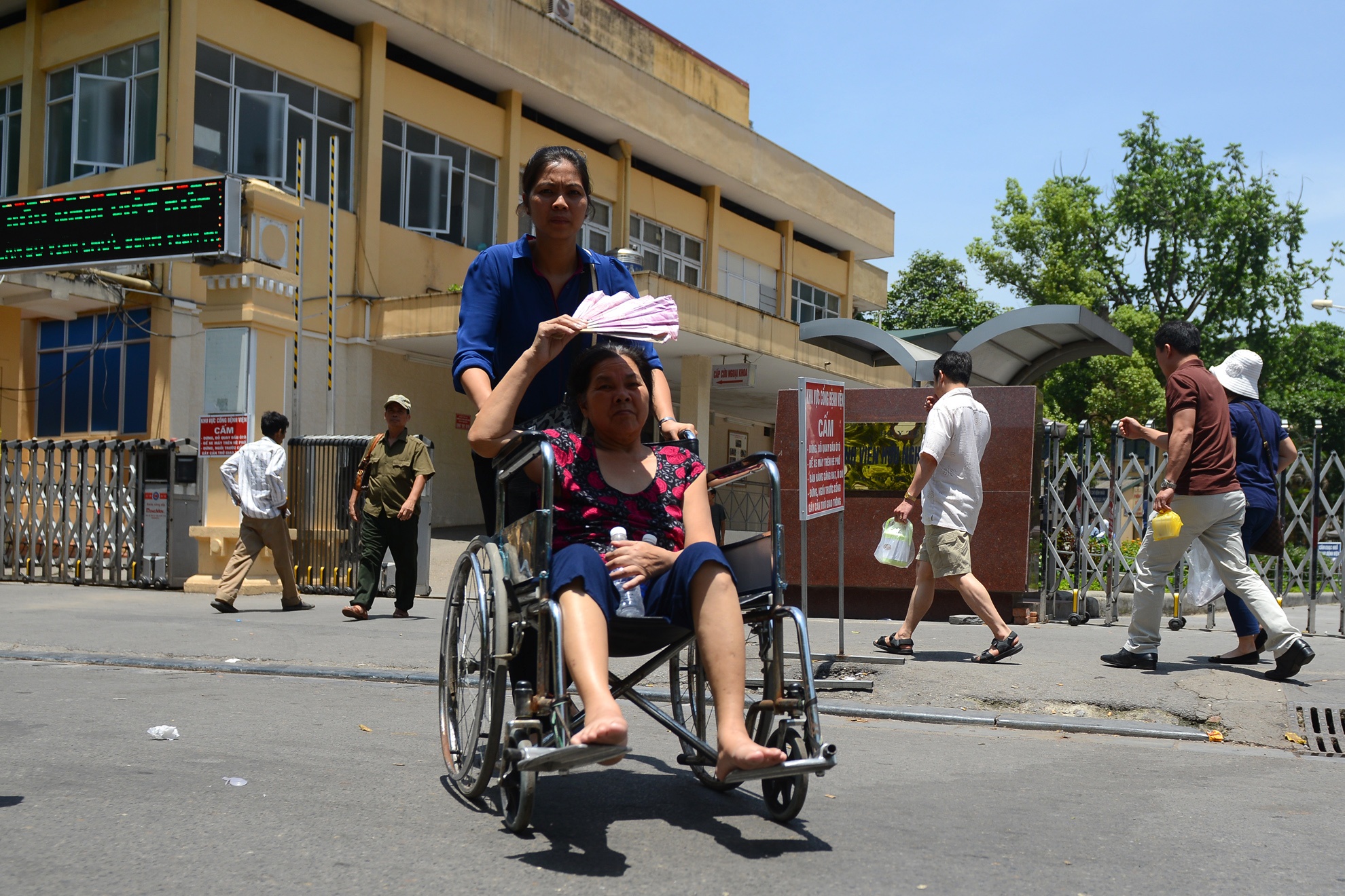 | Người nhà bệnh nhân chờ đợi ngoài cổng viện, đắp khăn mặt ướt lên đầu để hạ nhiệt sức nóng của phòng khám và của cả cái nắng hè 40 độ C. |