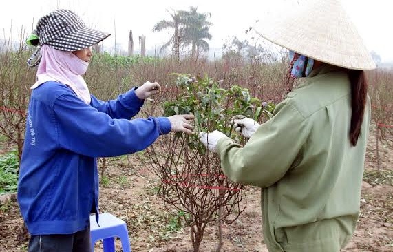 Hiện dân làng đào Nhật Tân đang tập trung làm những công đoạn cuối cùng để đào kịp ra hoa dịp Tết nguyên đán như tưới nước, tuốt lá đúng thời điểm... Số đào nở hoa không quá rầm rộ nhưng đủ làm nhiều gương mặt bồn chồn, lo lắng.