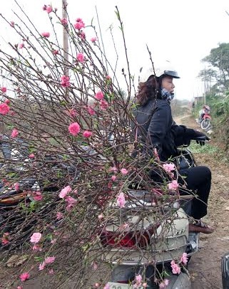 Cầm trên tay hai cành đào hoa đỏ tươi, nở bung đều và đẹp vừa được chặt tại vườn, cô Liên (Hoàng Hoa Thám, Hà Nội) phấn khởi cho biết, đã “săn” đào từ nhiều ngày nay. Là người thích hoa đào, lại chăm chỉ đọc báo, cô được biết một số cành đào Nhật Tân đã lác đác nở hoa. Chọn ngày cuối tuần rảnh rang, cô đi về làng đào, tìm đếm từng cành, lựa mua từng cành hoa đẹp nhất.