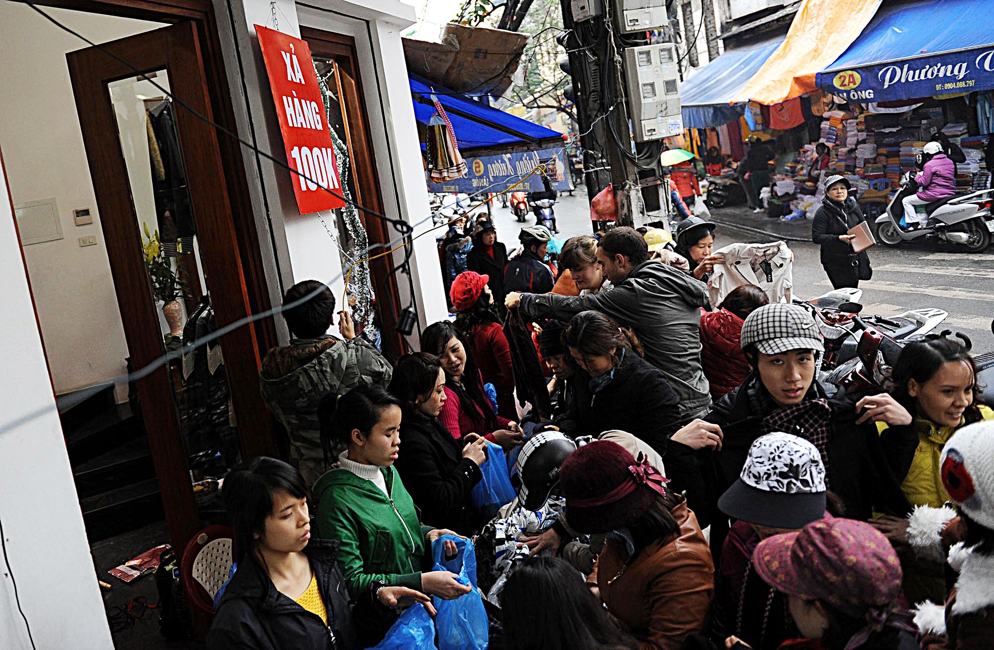 | Một cửa hàng giảm giá trên phố Lãn Ông (quận Hoàn Kiếm), khách chen lấn để được mua hàng giá rẻ. |