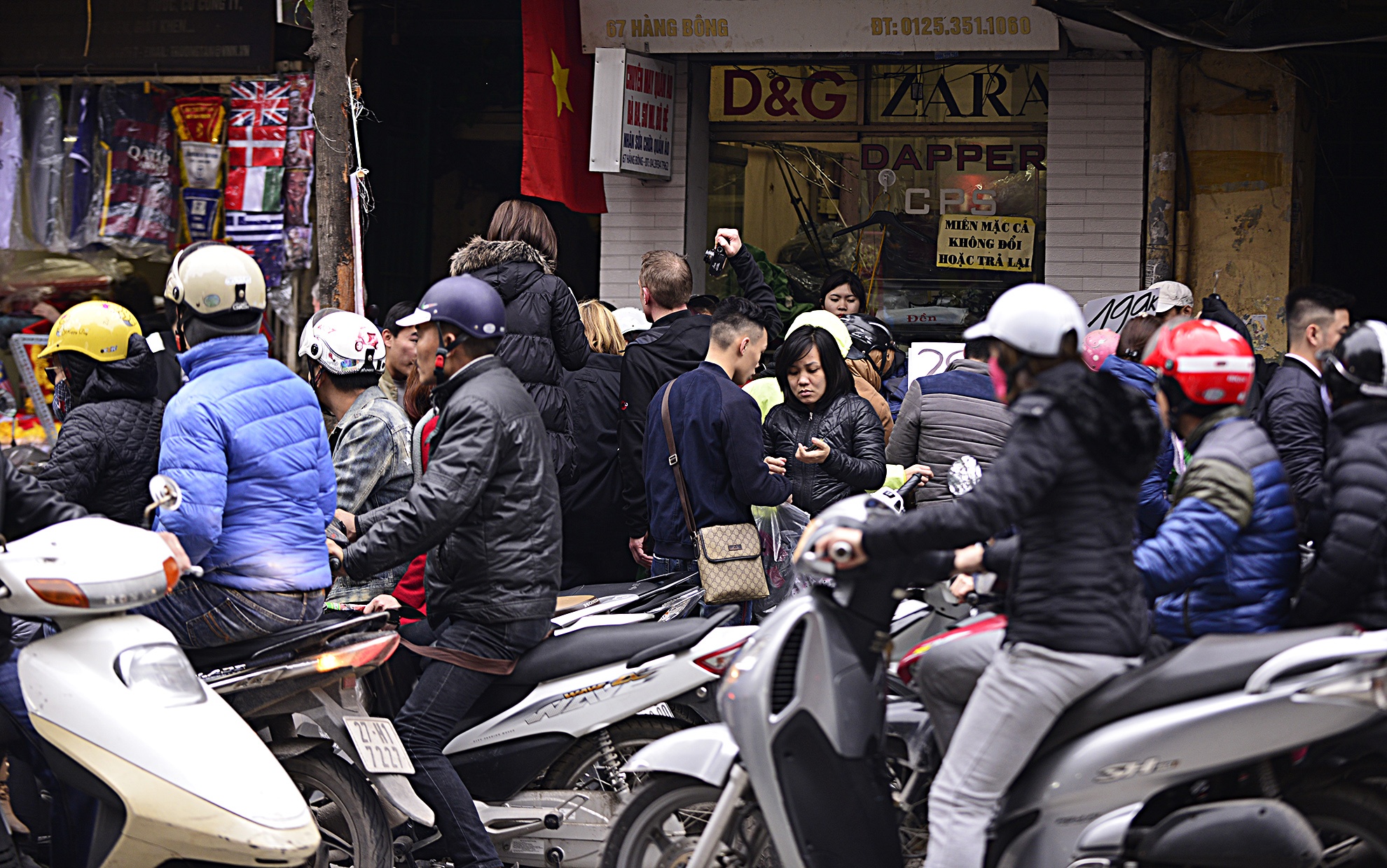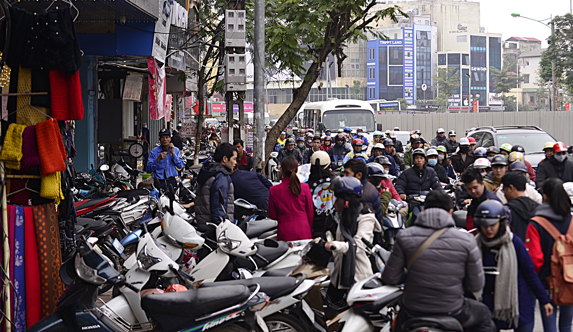 | Các cửa hàng bán quần áo trên phố Hàng Bông, Hàng Ngang, Hàng Đường đông đúc, xe để tràn ra lề đường khiến giao thông tắc nghẽn. |