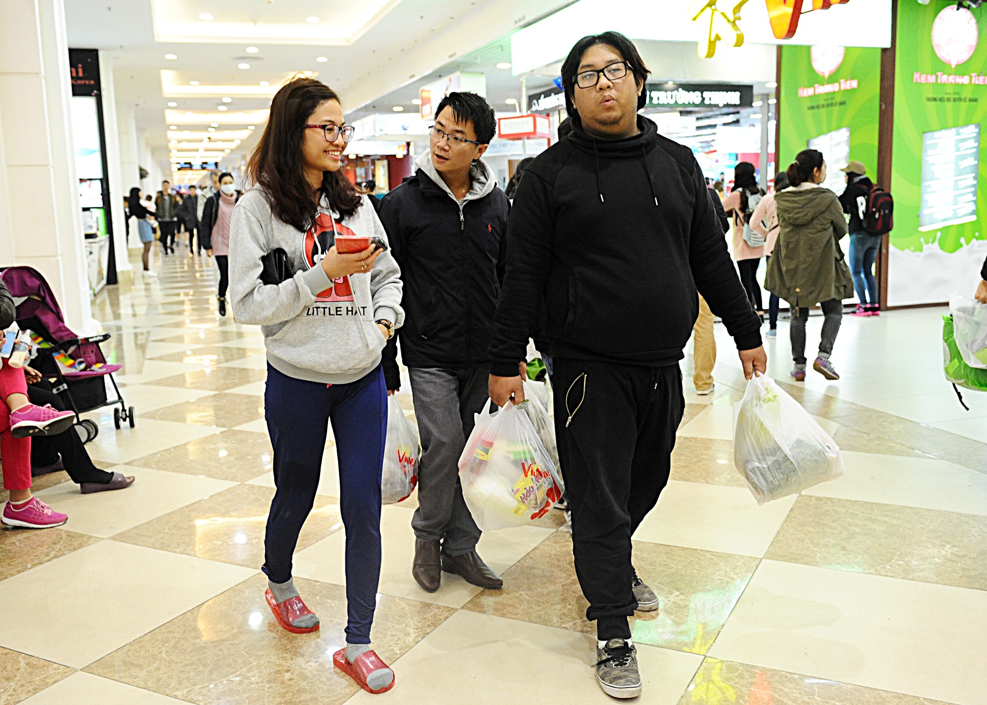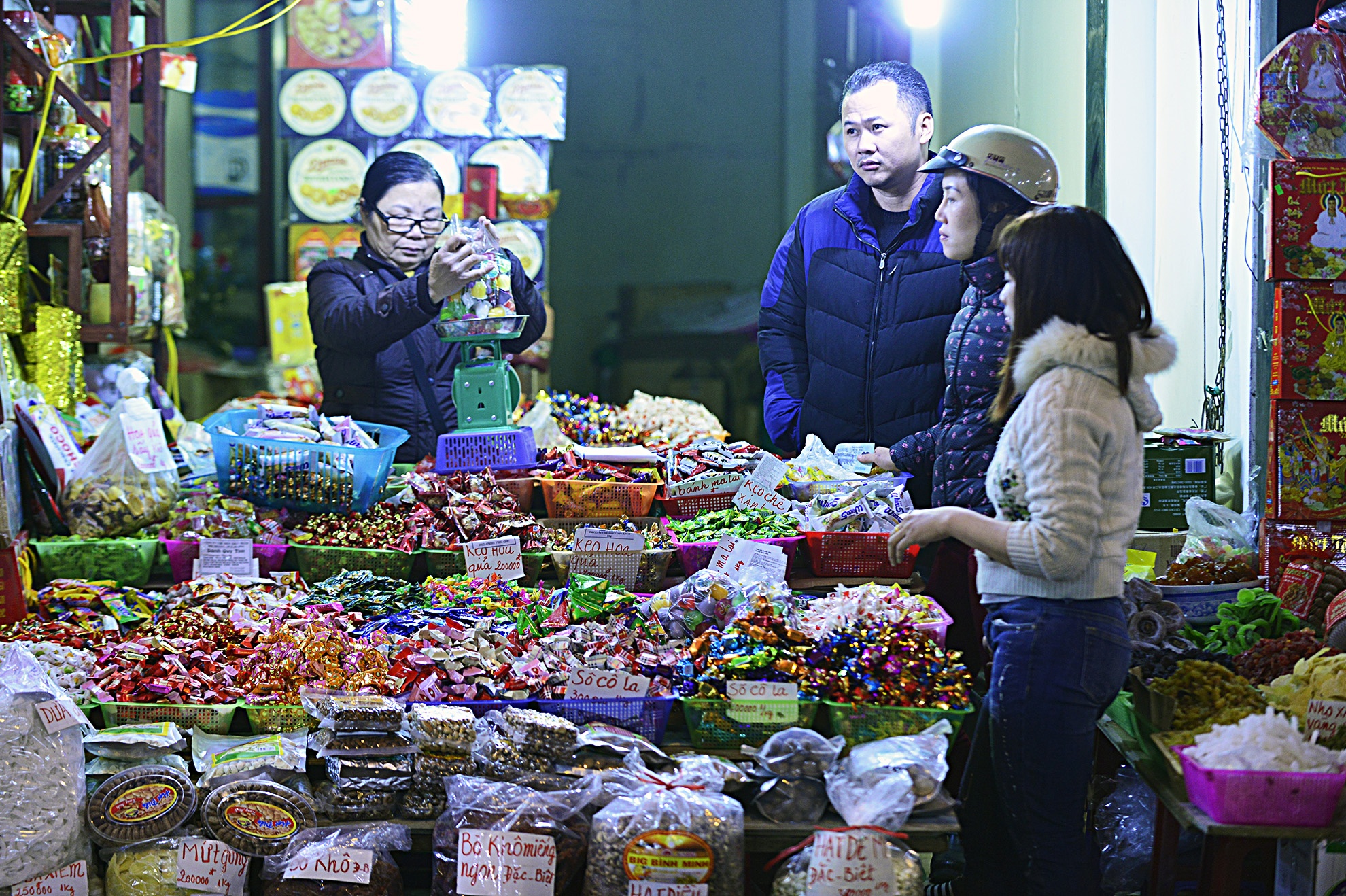| Ngày 30/1, nhiều gia đình đã đến các khu chợ, trung tâm mua sắm như Hàng Lược, Hội chợ xuân tại Triển lãm Giảng Võ (Hà Nội) để mua sắm Tết. |