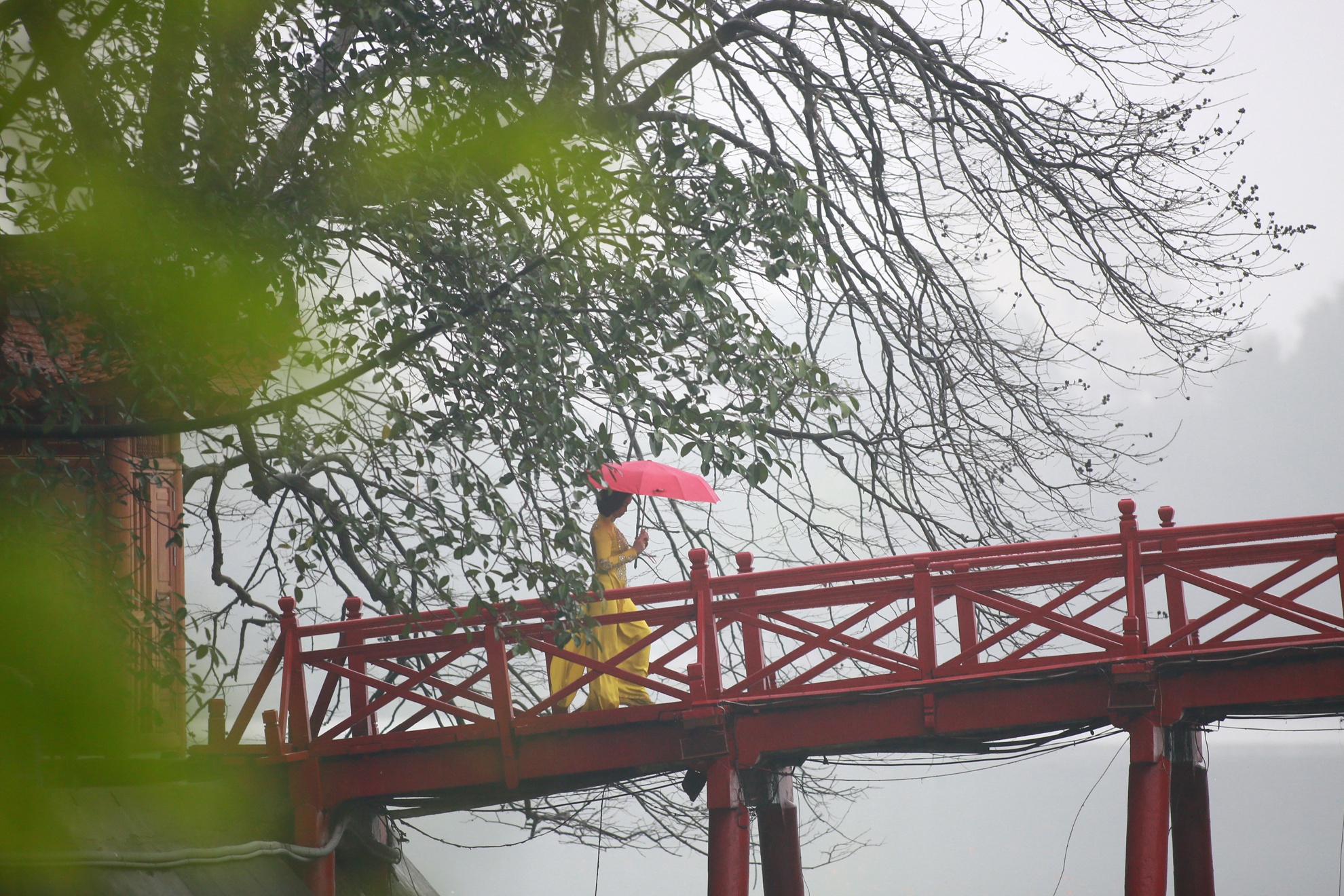 | 7h sáng tại cầu Thê Húc, màn sương mờ cũng tạo ra hình ảnh đậm chất thơ.