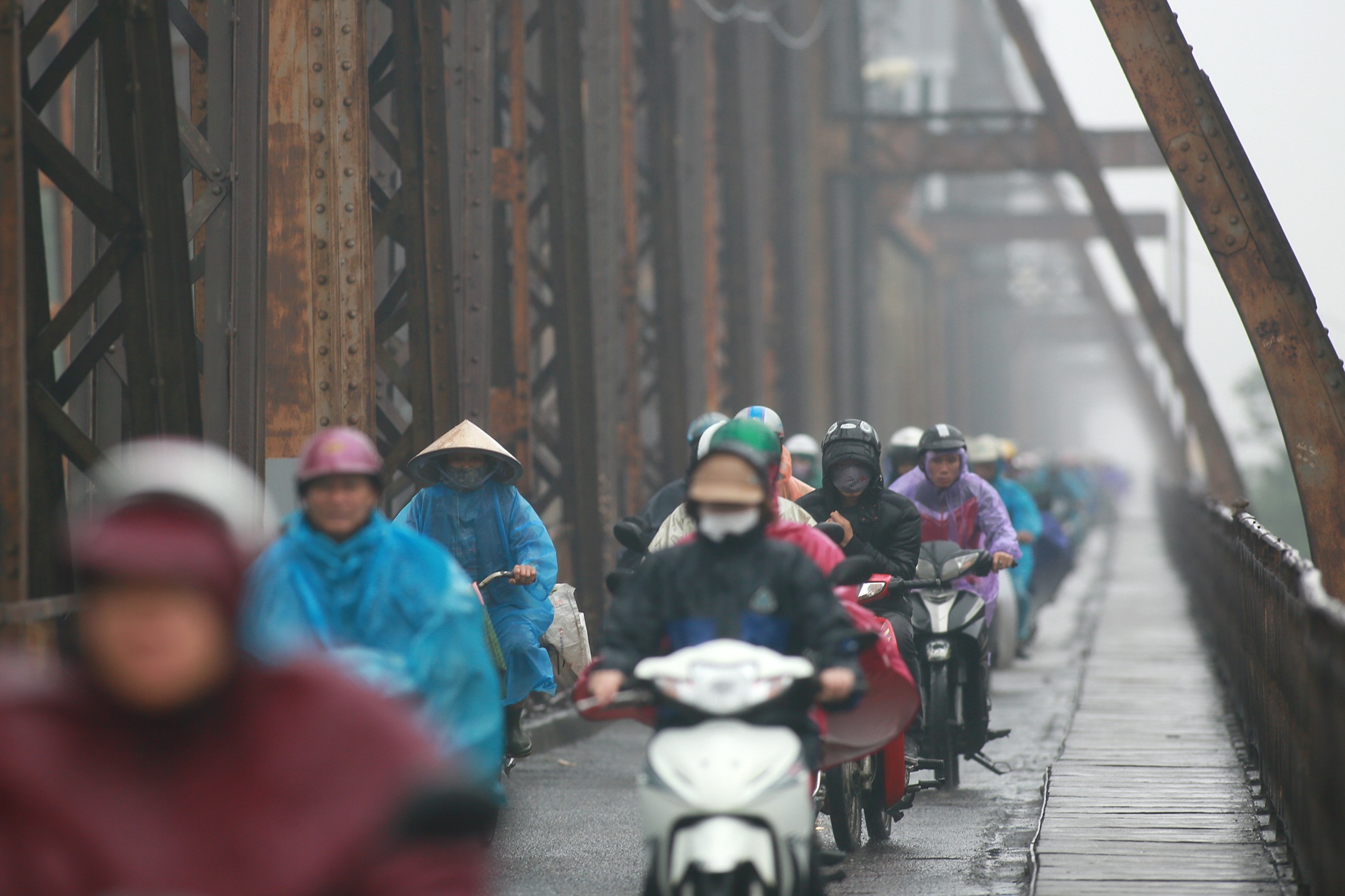| Xe đạp và xe máy chầm chậm đi qua cầu trong làn mưa phùn nhẹ và mặt đường trơn. |
