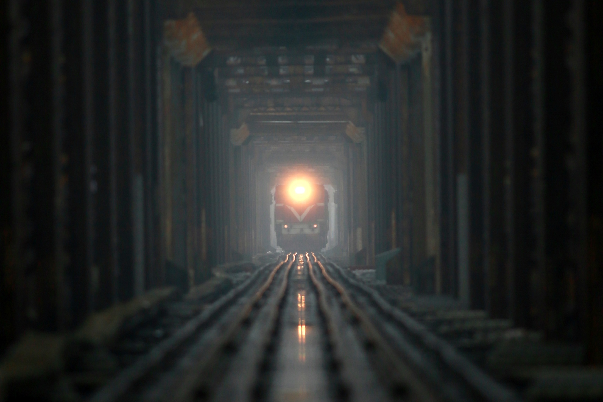 | 8h30, chuyến tàu về ga Long Biên phải bật đèn chiếu trong màn sương phủ kín làm khuất tầm nhìn bên trong làn đường sắt trên cầu. |