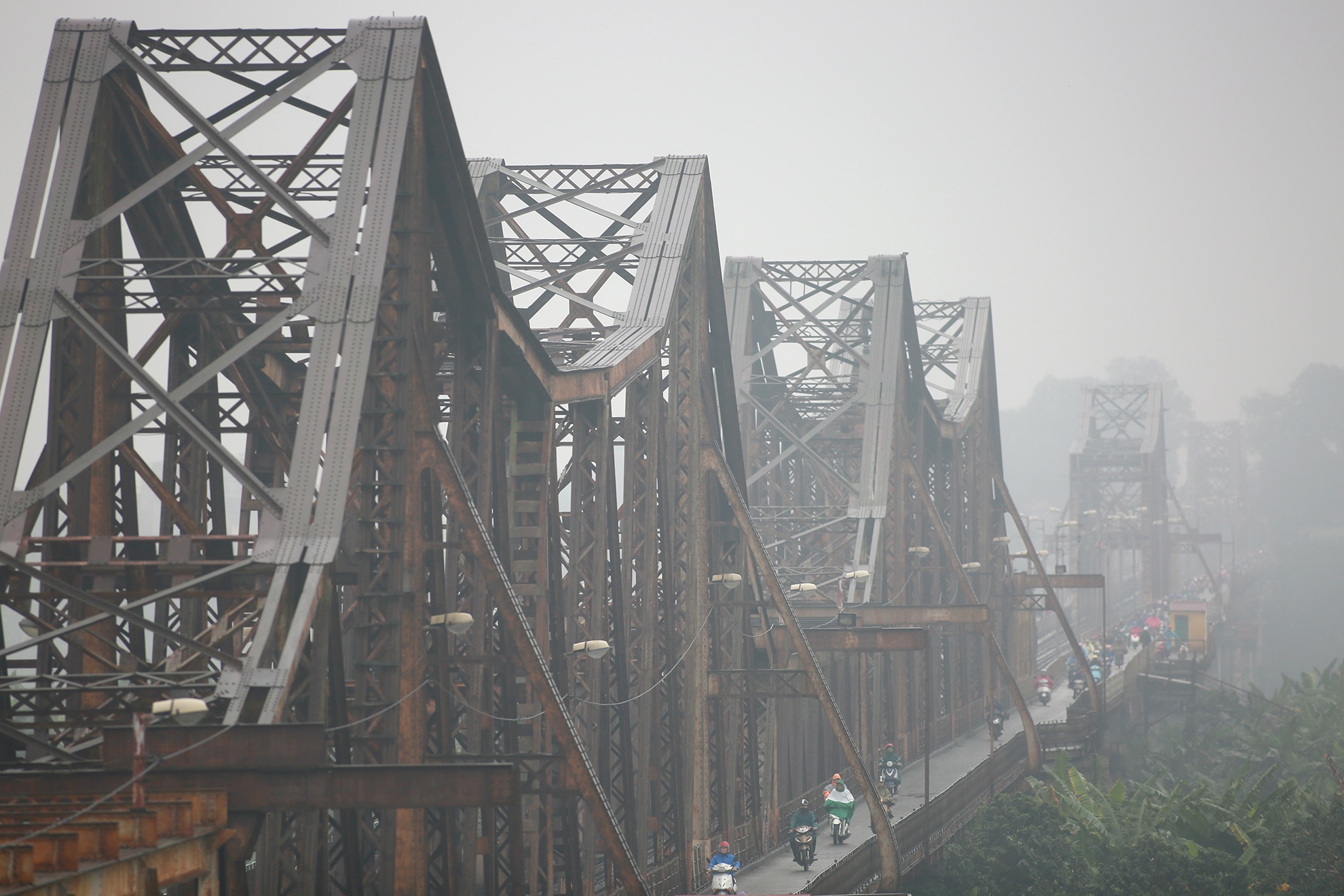 | Nhìn từ xa, cây cầu hơn 100 tuổi ẩn hiện trong màn sương. |