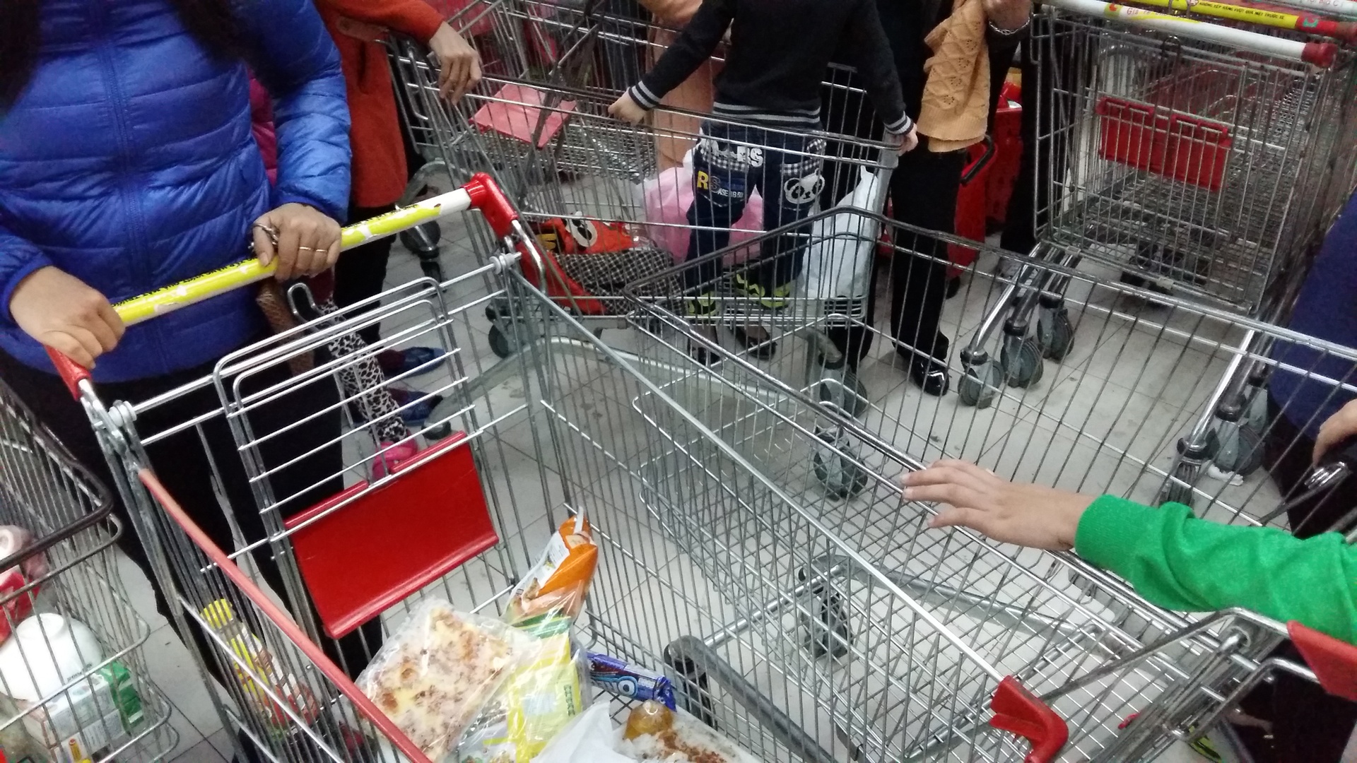 | Khách sử dụng xe đẩy mua hàng di chuyển rất khó khăn do lối đi chật cứng. |