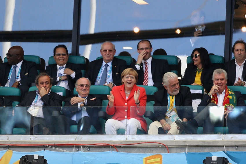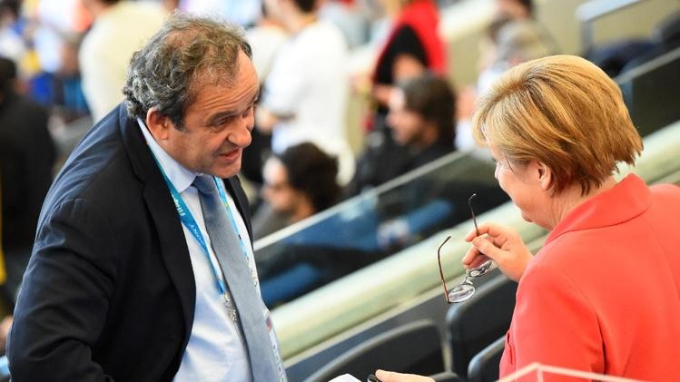 Nữ thủ tướng Đức trò chuyện với Chủ tịch Liên đoàn Bóng đá châu Âu Michel Platini trên khán đài sân Maracana trước khi trận chung kết diễn ra. Ảnh: AP |
