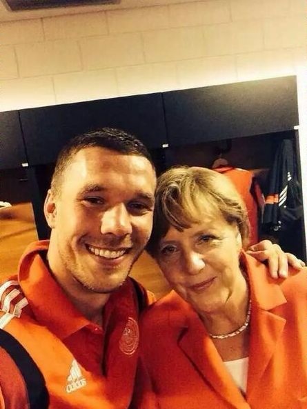 Merkel chụp ảnh cùng các tuyển thủ Đức trong phòng thay đồ sau chiến thắng 4 – 0 trước đội tuyển Bồ Đào Nha hôm 16/6. Ảnh: Getty Images |
