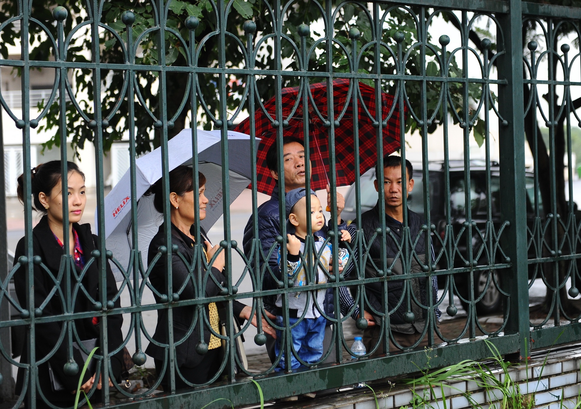 | Người hâm mộ đội mưa rét theo dõi ĐTVN thi đấu đối kháng trong buổi tập chiều nay (7/11). |