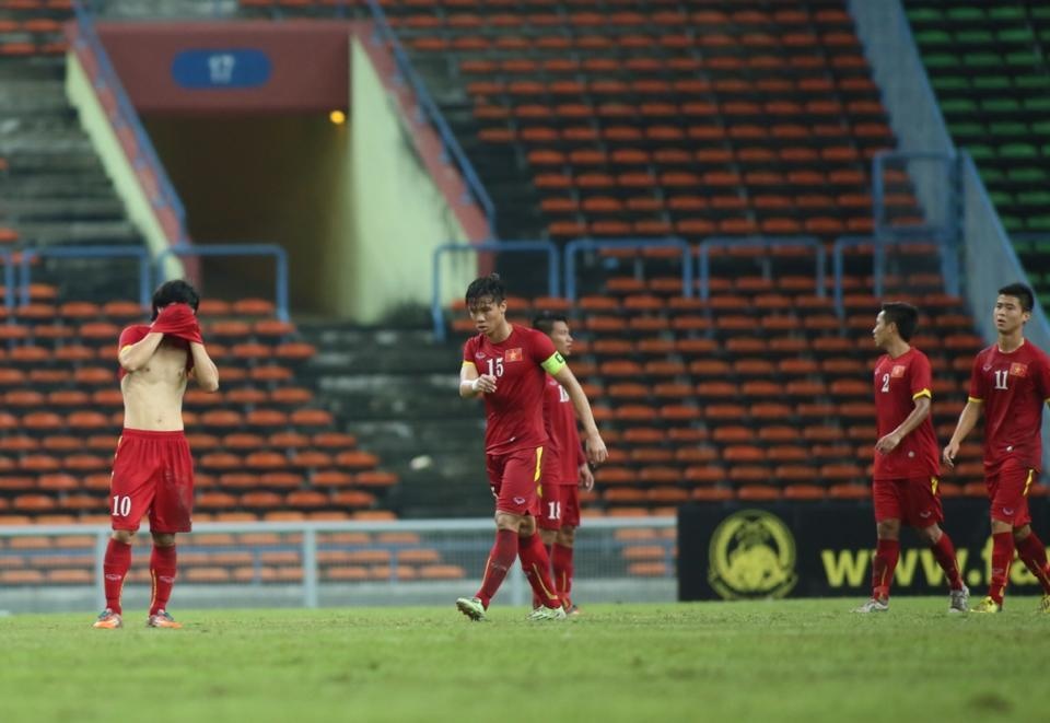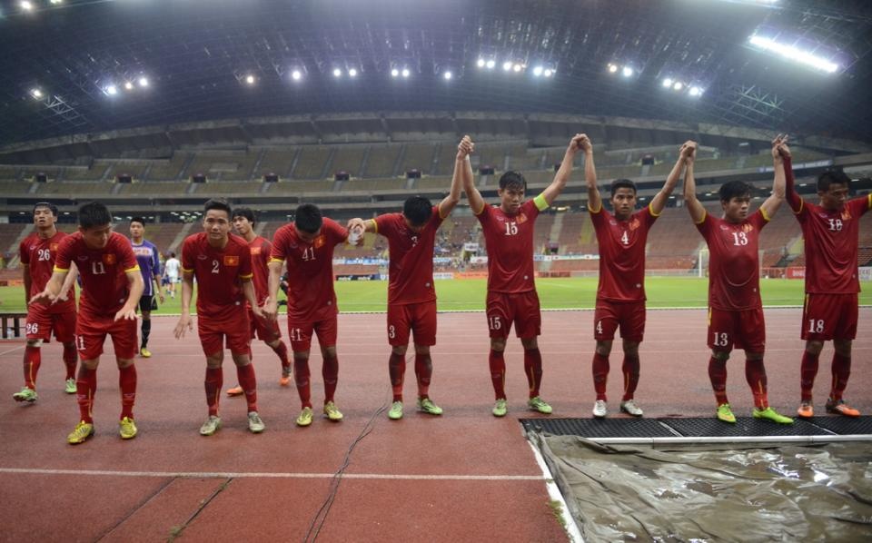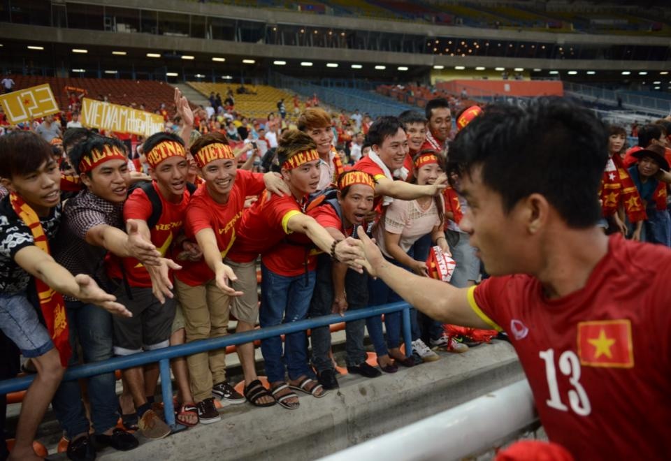 | Các cầu thủ nắm tay nhau chạy tới khán đài cảm ơn người hâm mộ nước nhà đã tới sân Shah Alam cổ vũ đội tuyển thi đấu. |