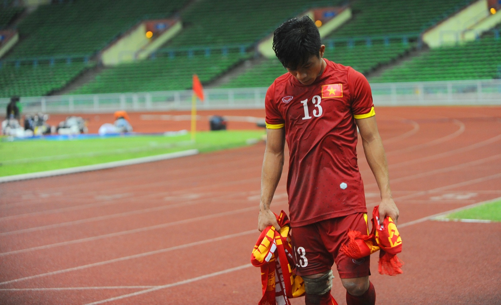 | Sau khi nhận được khăn cổ động, băng rôn động viên, Tấn Tài vẫn đượm buồn khi đi về khu vực kỹ thuật của U23 Việt Nam. |