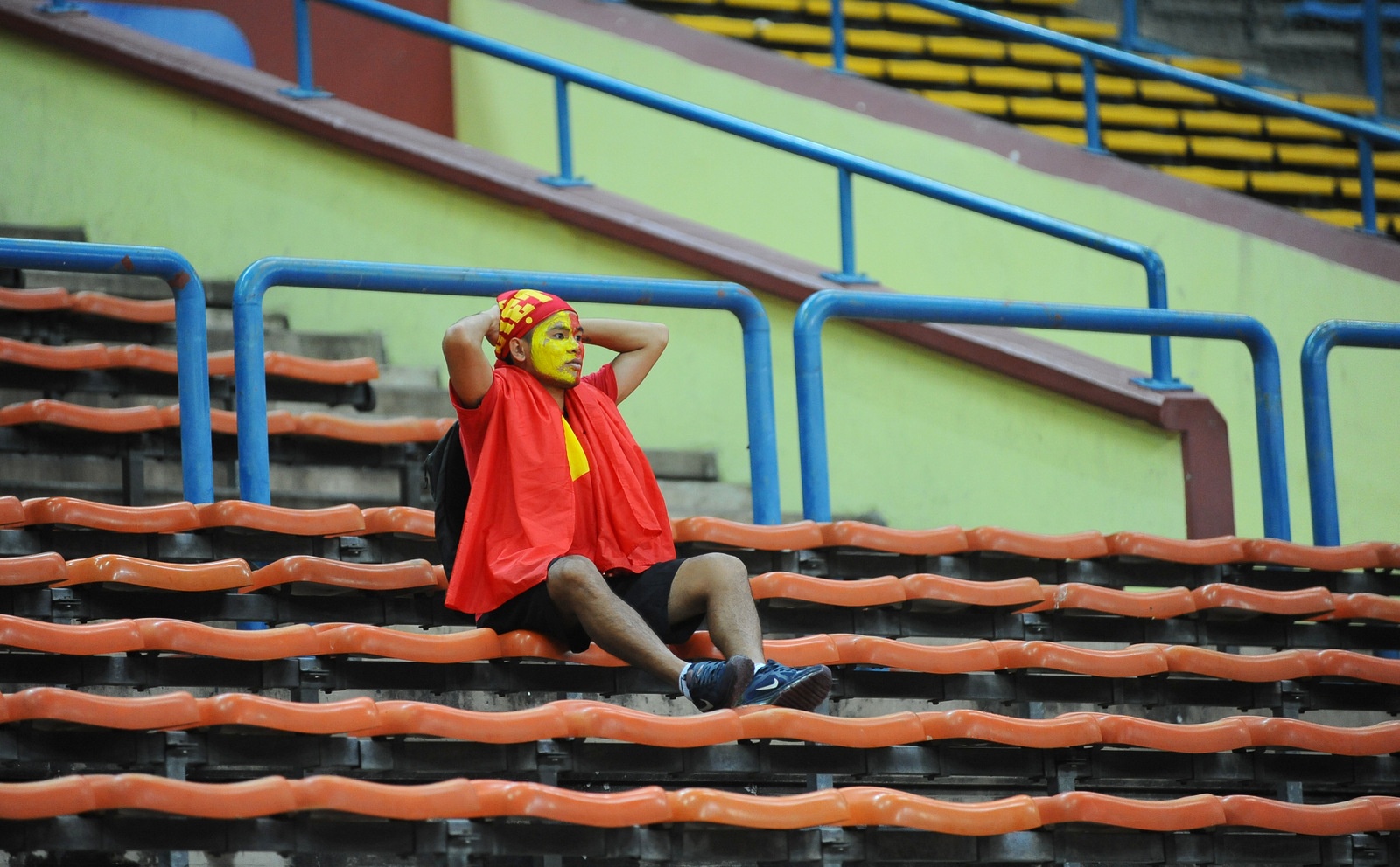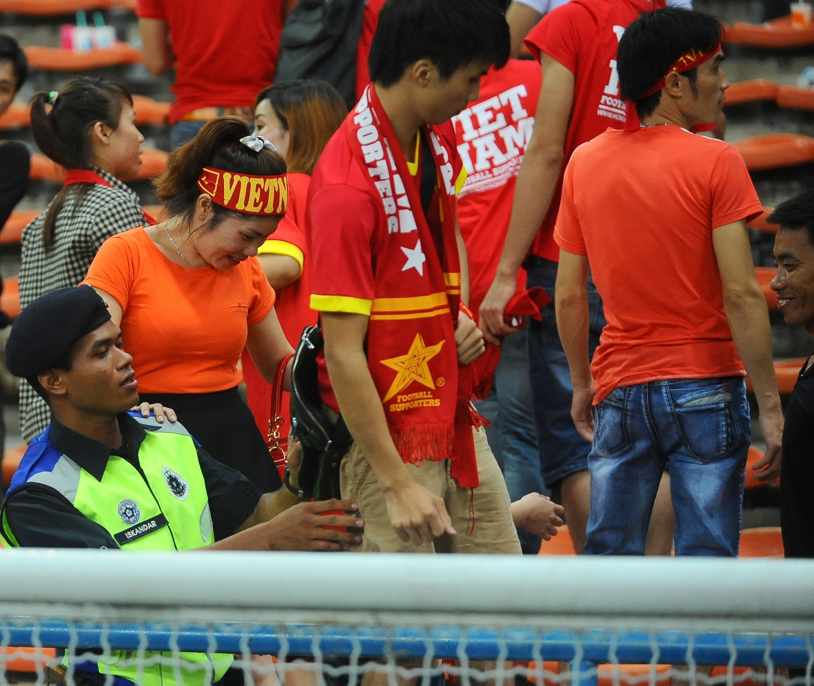| CĐV Việt Nam nán lại chờ thầy trò HLV Miura rời sân Shah Alam. Tuy nhiên, lực lượng an ninh phía Malaysia đã can thiệp để mời khán giả rời sân nhằm đảm bảo an ninh. |