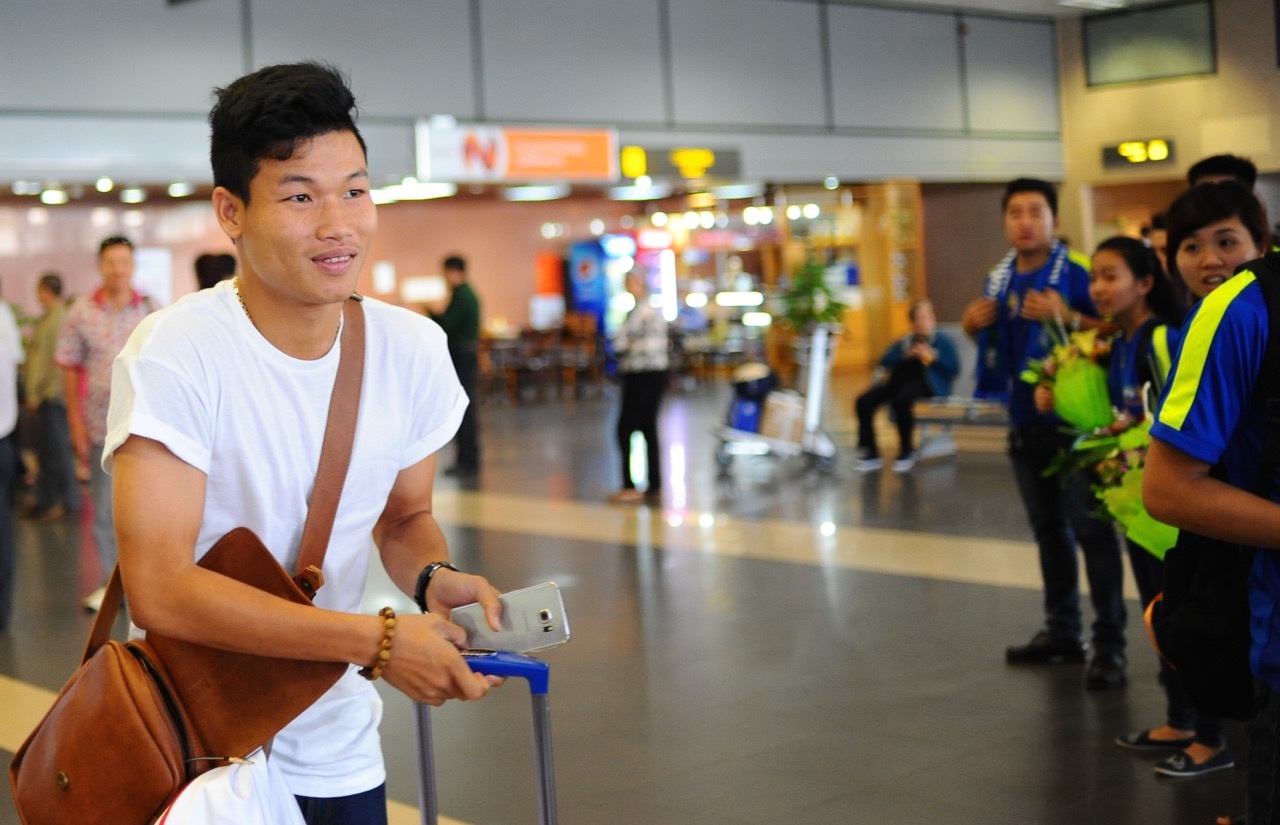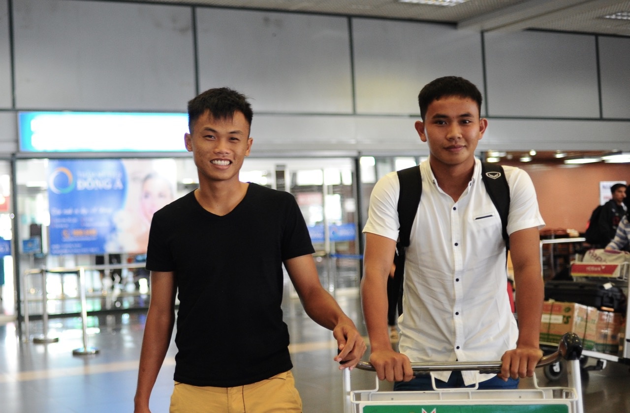 | Hai tuyển thủ trẻ gồm Duy Khánh (trái) và Thanh Tuấn (phải) cũng có mặt tại sân bay Nội Bài trưa 1/12. Đôi bạn thân trong màu áo U19 Việt Nam háo hức khi lần đầu tiên được góp mặt trong danh sách U23 Việt Nam. "Được gọi lên U23 là cơ hội những cũng là thử thách để chúng em phấn đấu", Duy Khánh chia sẻ trước khi lên xe về "đại bản doanh" của U23 Việt Nam. |