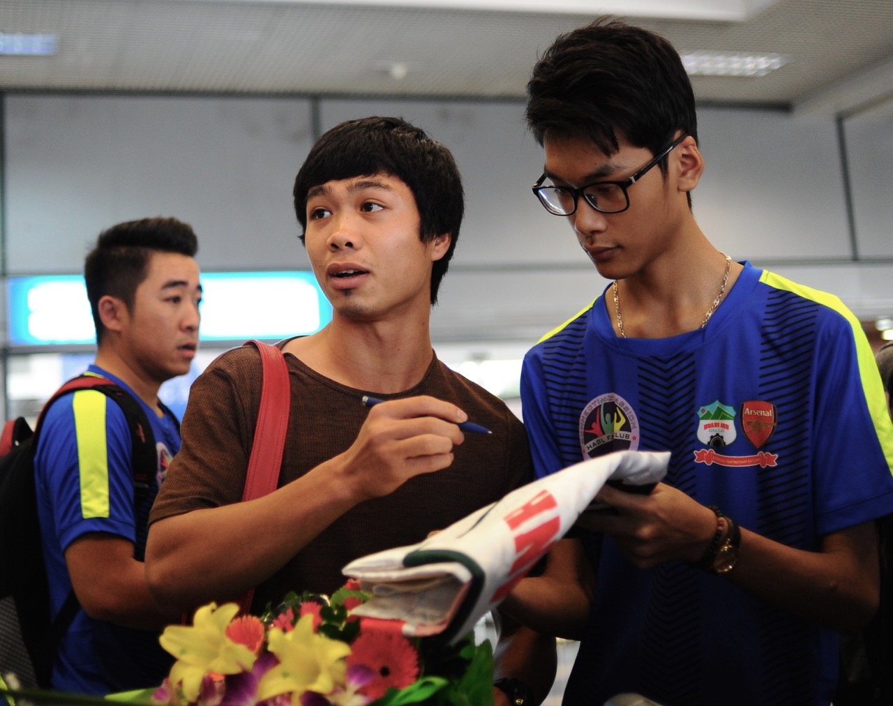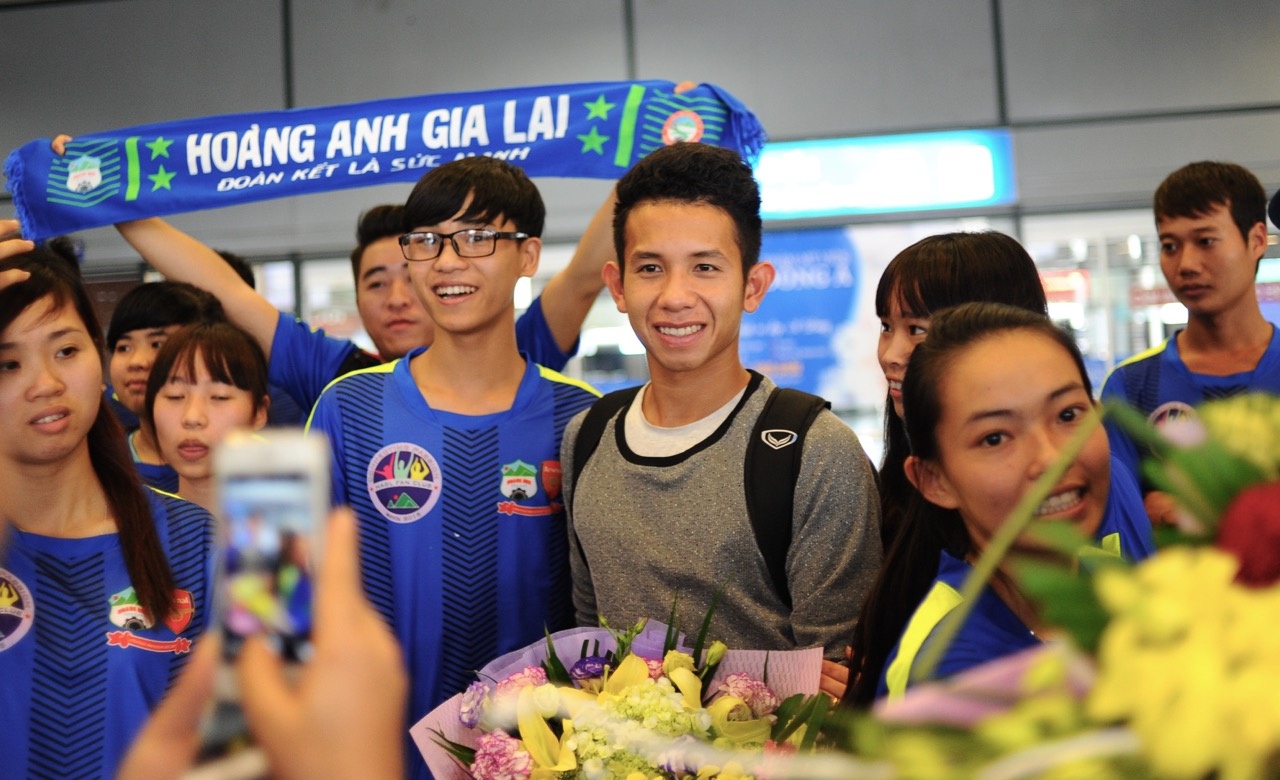 | Đông Triều tới sớm và ở lại sảnh đợi nhóm cầu thủ HAGL gồm Công Phượng, Văn Toàn, Hồng Duy bay từ TP HCM ra Hà Nội. Đội trưởng của HAGL tại giải U21 quốc tế được rất đông người hâm mộ vây quanh. |