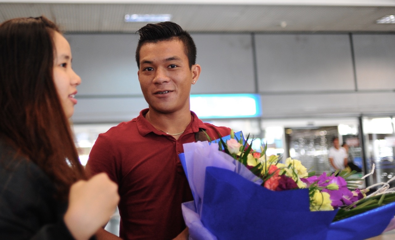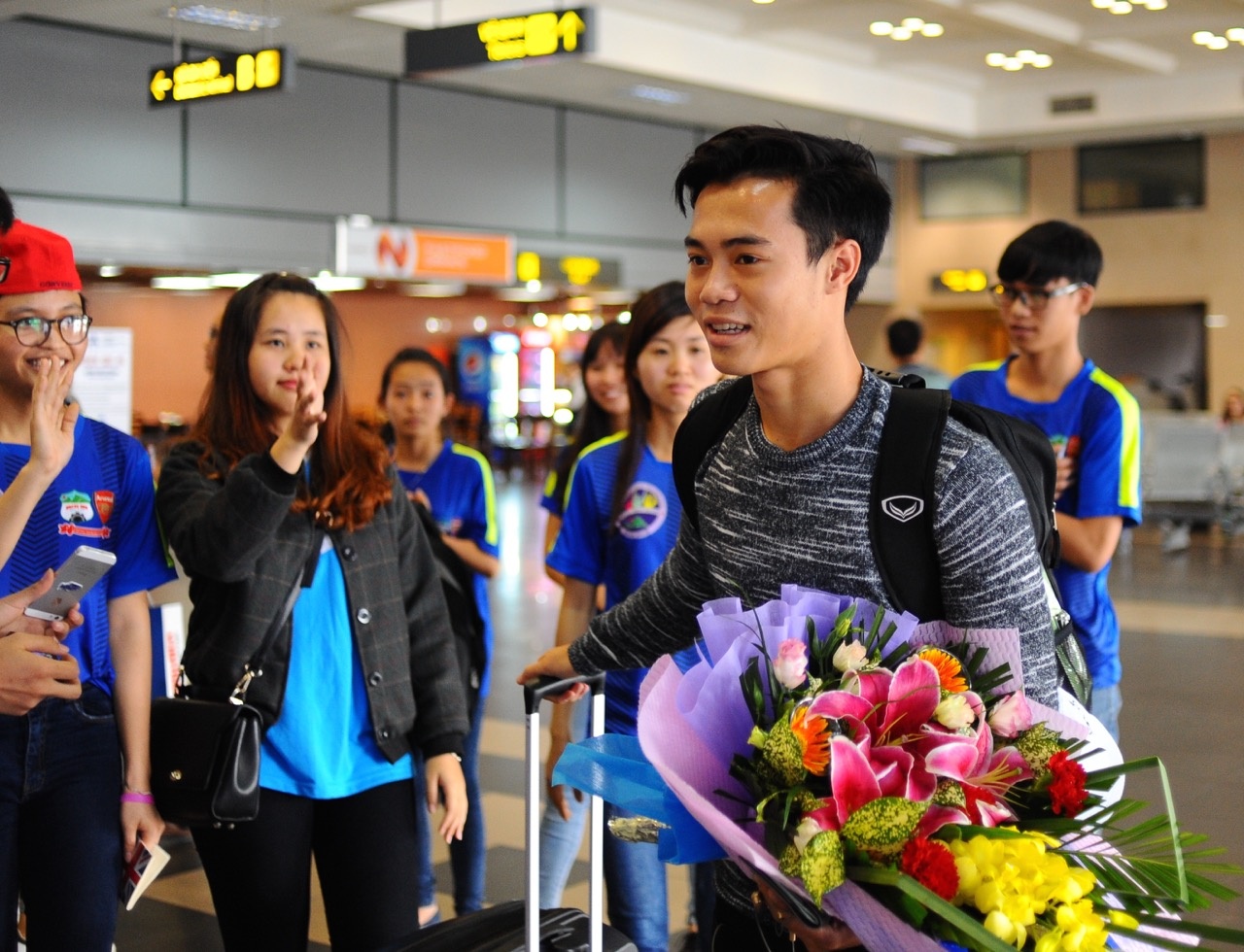 | Đông Triều là cầu thủ đầu tiên có mặt tại sảnh đến sân bay Nội Bài (Hà Nội). Sau khi giành chức vô địch giải U21 quốc tế, Triều tranh thủ về thăm gia đình tại Quảng Nam, trước khi có mặt tại Hà Nội hội quân cùng các đồng đội U23. Trung vệ của HAGL cảm động khi có hàng chục người hâm mộ chờ đón tại sân bay. "Tôi cảm thấy bất ngờ khi HLV Miura điền tên mình vào danh sách U23 Việt Nam ở vị trí tiền vệ. Tuy nhiên, tôi sẽ cố gắng tập luyện để đáp ứng yêu cầu từ HLV người Nhật Bản", Đông Triều chia sẻ trong khi đợi các đồng đội HAGL hạ cánh. |