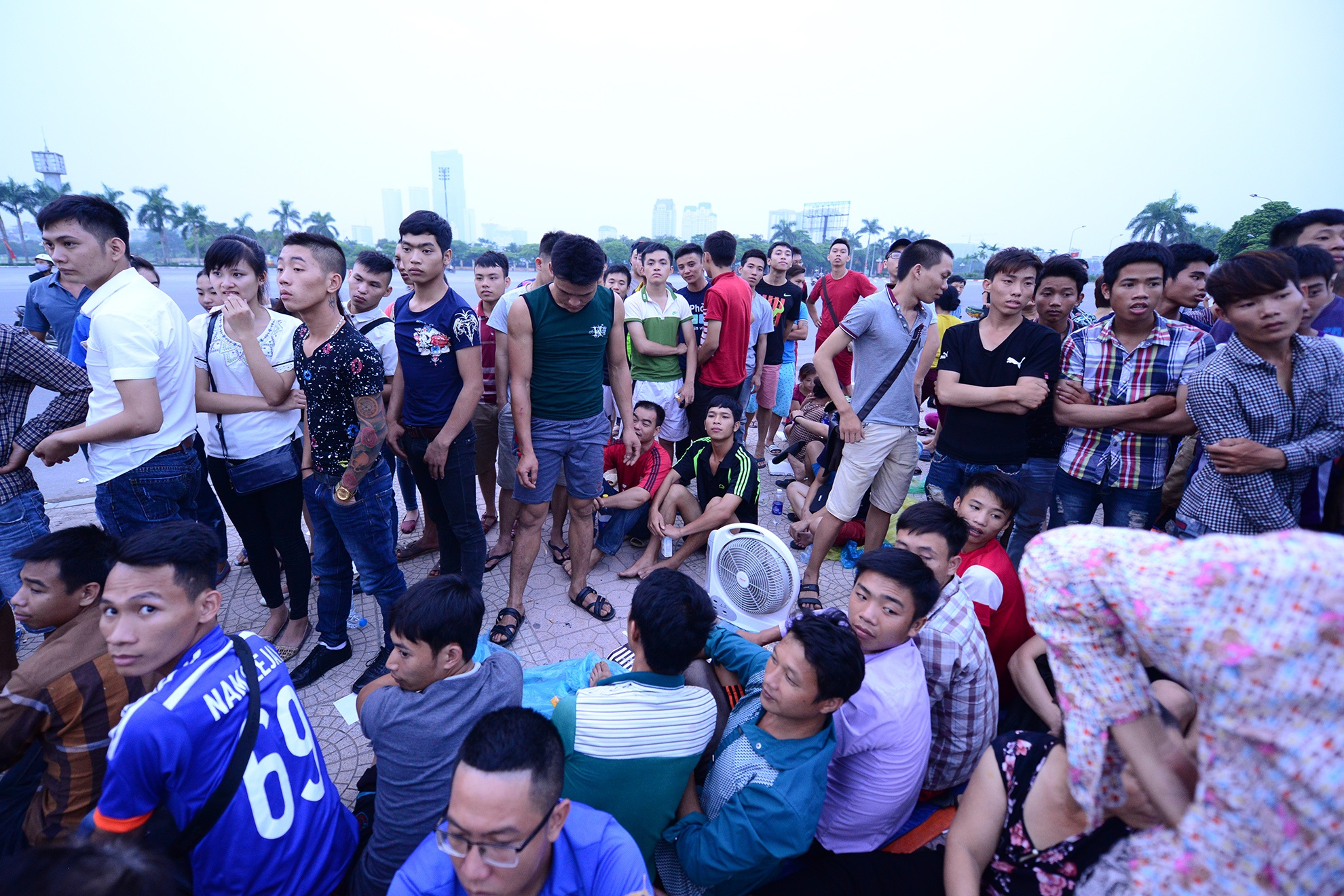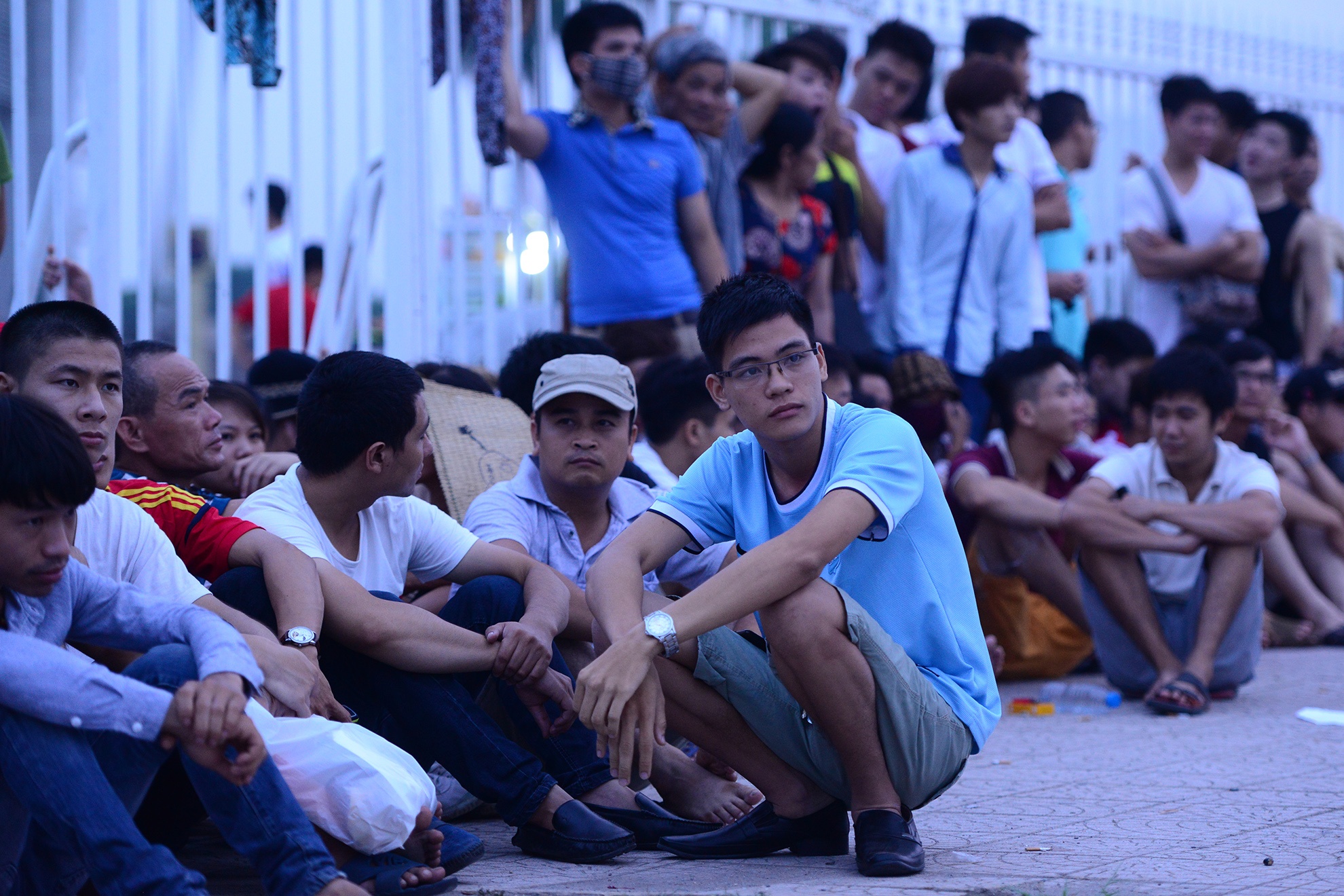 Anh Lò Văn Nương cùng 6 người bạn (quê ở Thanh Hoá) đang làm việc tại Hà Nội rủ bạn bè ra sân vận động Mỹ Đình xếp hàng từ 22h đêm hôm trước. Họ còn mang theo quạt sạc điện để ngủ qua đêm.