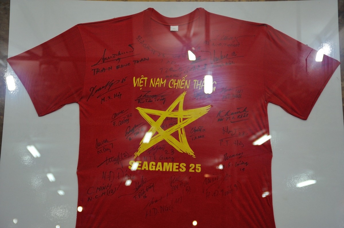 | Chiếc áo CĐV mà chủ quán bia đã sưu tầm từ SEA Games 25 với đầy đủ chứ ký của các cầu thủ. |