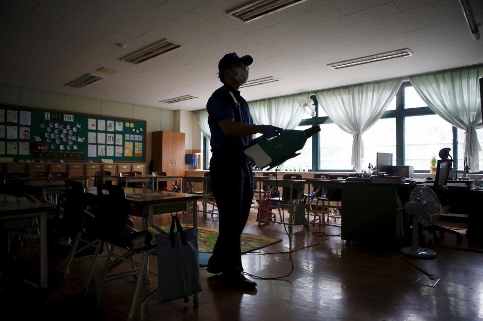 Nhân viên y tế phun thuốc khử trùng trong một phòng học ở thủ đô Seoul. Gần 2.000 trường học đã đóng cửa để ngăn MERS-CoV lây lan.