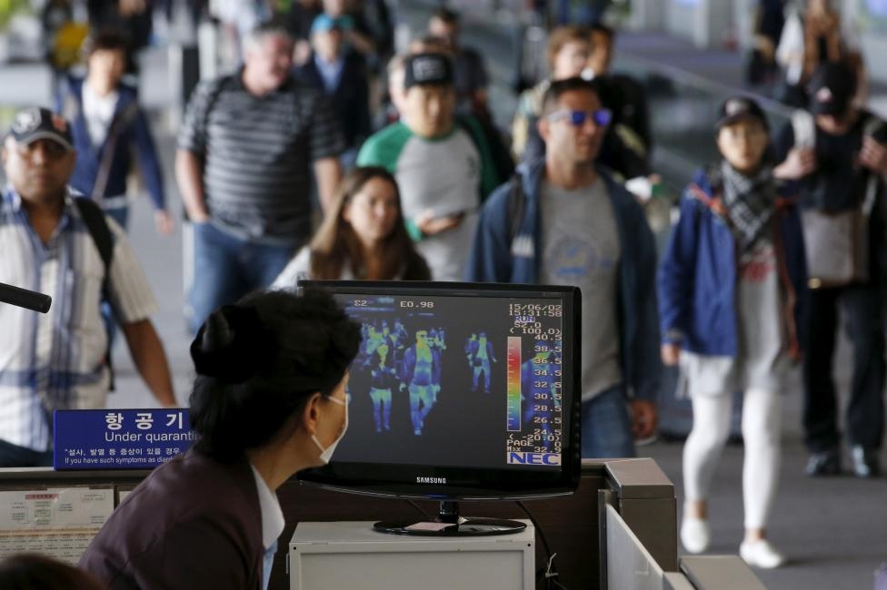 Nhân viên giám sát sử dụng máy quay tầm nhiệt để kiểm tra những trường hợp thân nhiệt cao tại sân bay quốc tế Incheon.