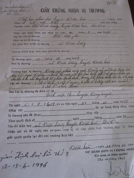 | Giấy nhứng nhận bị thương của UBND huyện Điện Bàn cho biết ông còn một mảnh đạn trong người. |