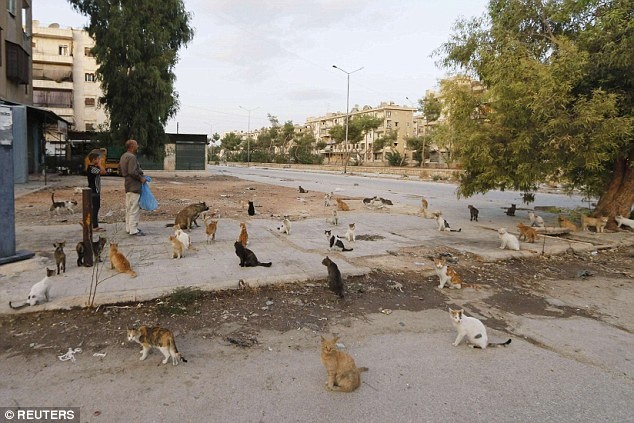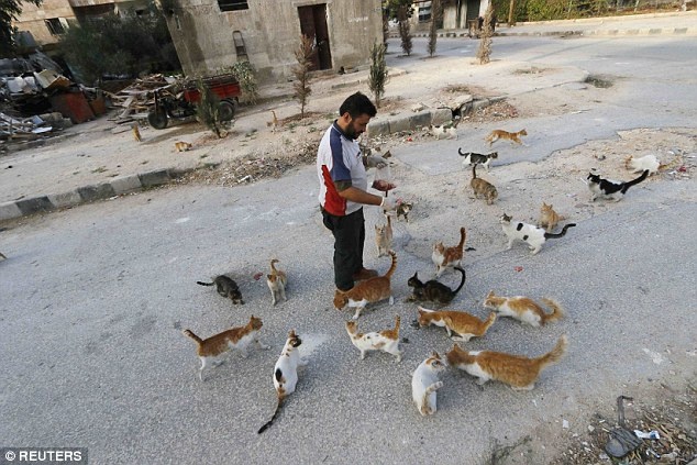 Hằng ngày, Alaa - tài xế lái xe cứu thương ở Syria - dành ra 4 USD tiền tiết kiệm để mua thức ăn cho khoảng 150 con mèo bị bỏ rơi ở quận Masaken Hanano, thành phố Aleppo, Syria. |