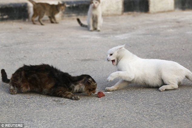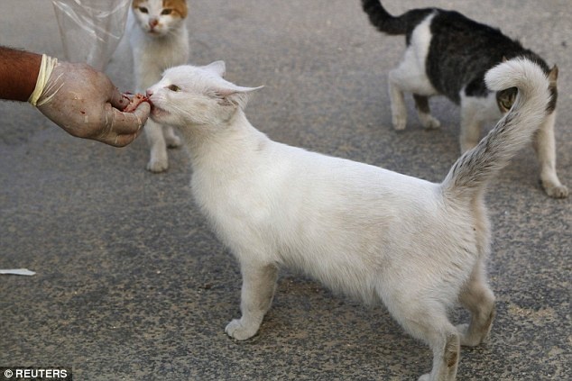 | Những con mèo đói tranh nhau miếng thịt mà Alaa mang tới. |