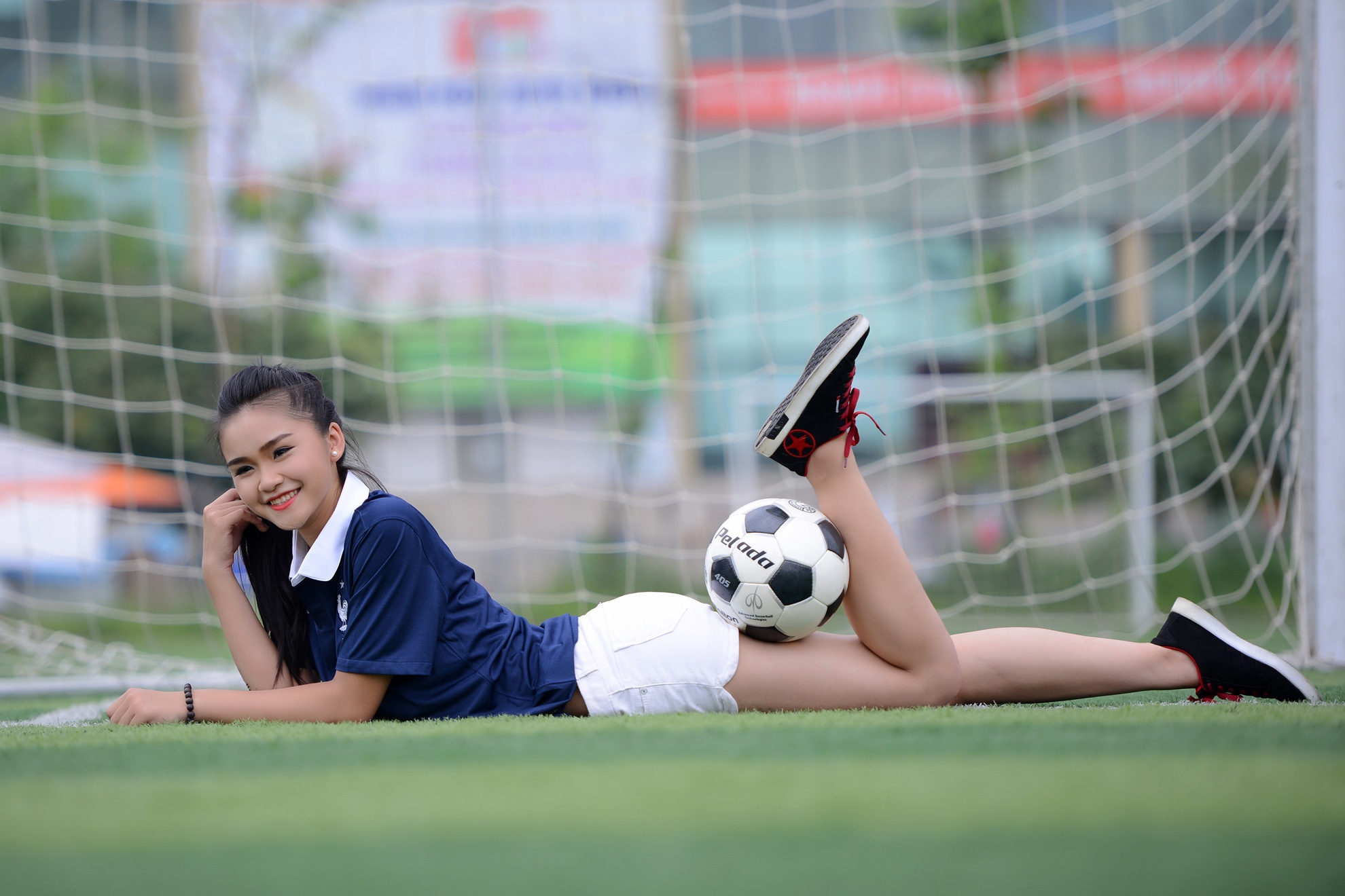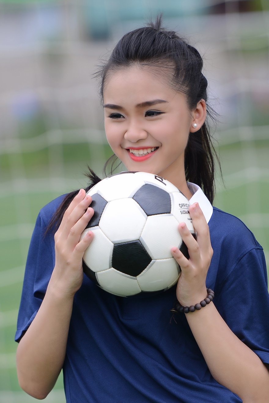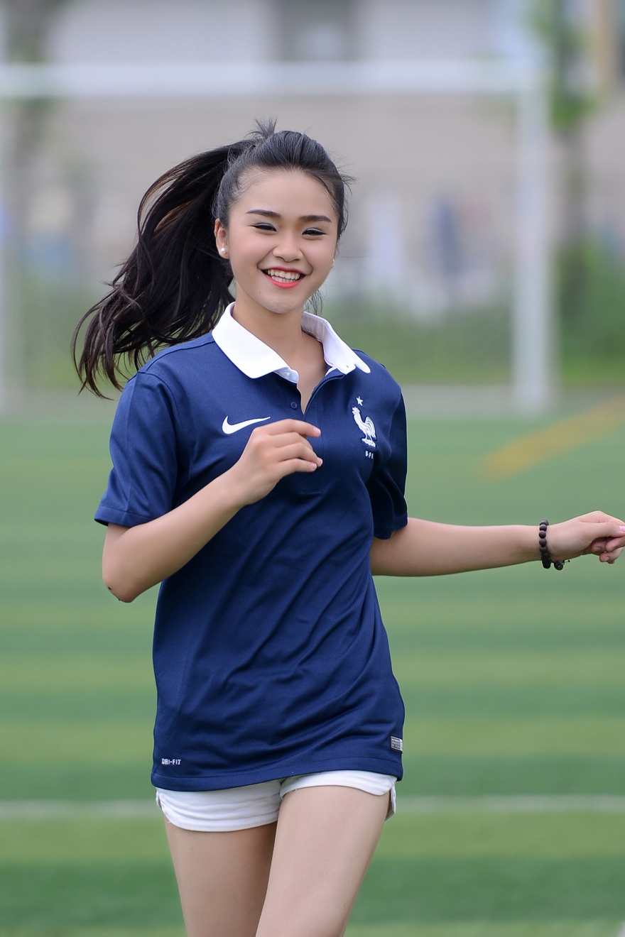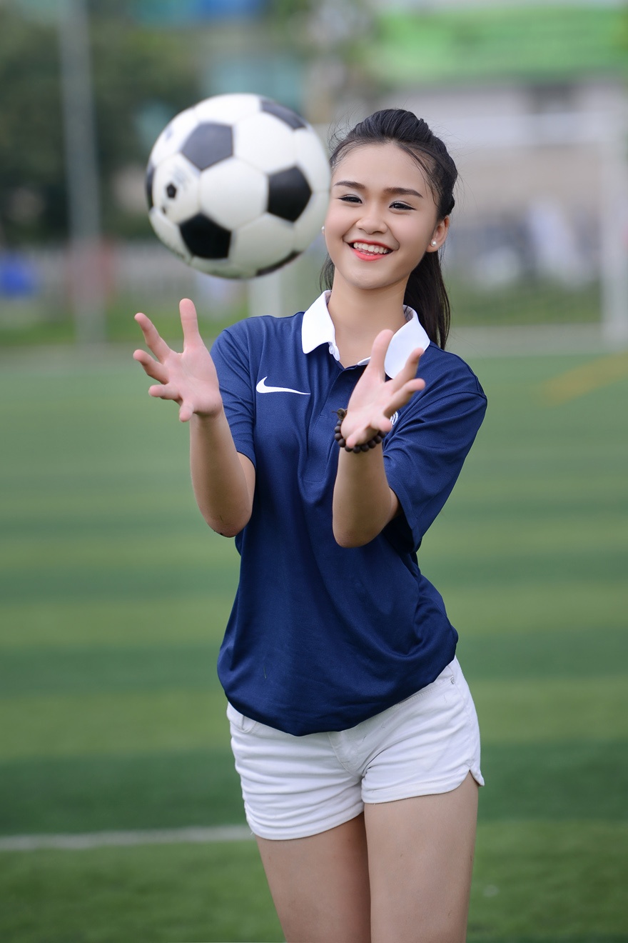 Trang thể hiện khả năng chơi bóng của mình trên sân cỏ nhân tạo Minh Kiệt, đường Hoàng Minh Giám.