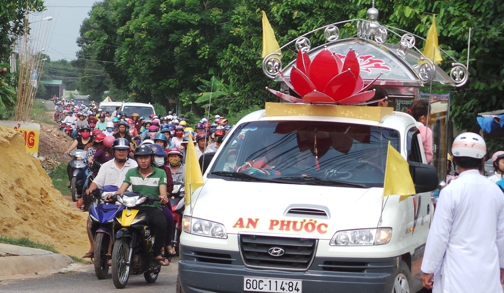 | Hàng trăm người dân đi xe máy theo đưa tiễn bốn nạn nhân trong vụ hỏa hoạn về nơi an nghỉ. Ảnh: Trường Nguyên. |