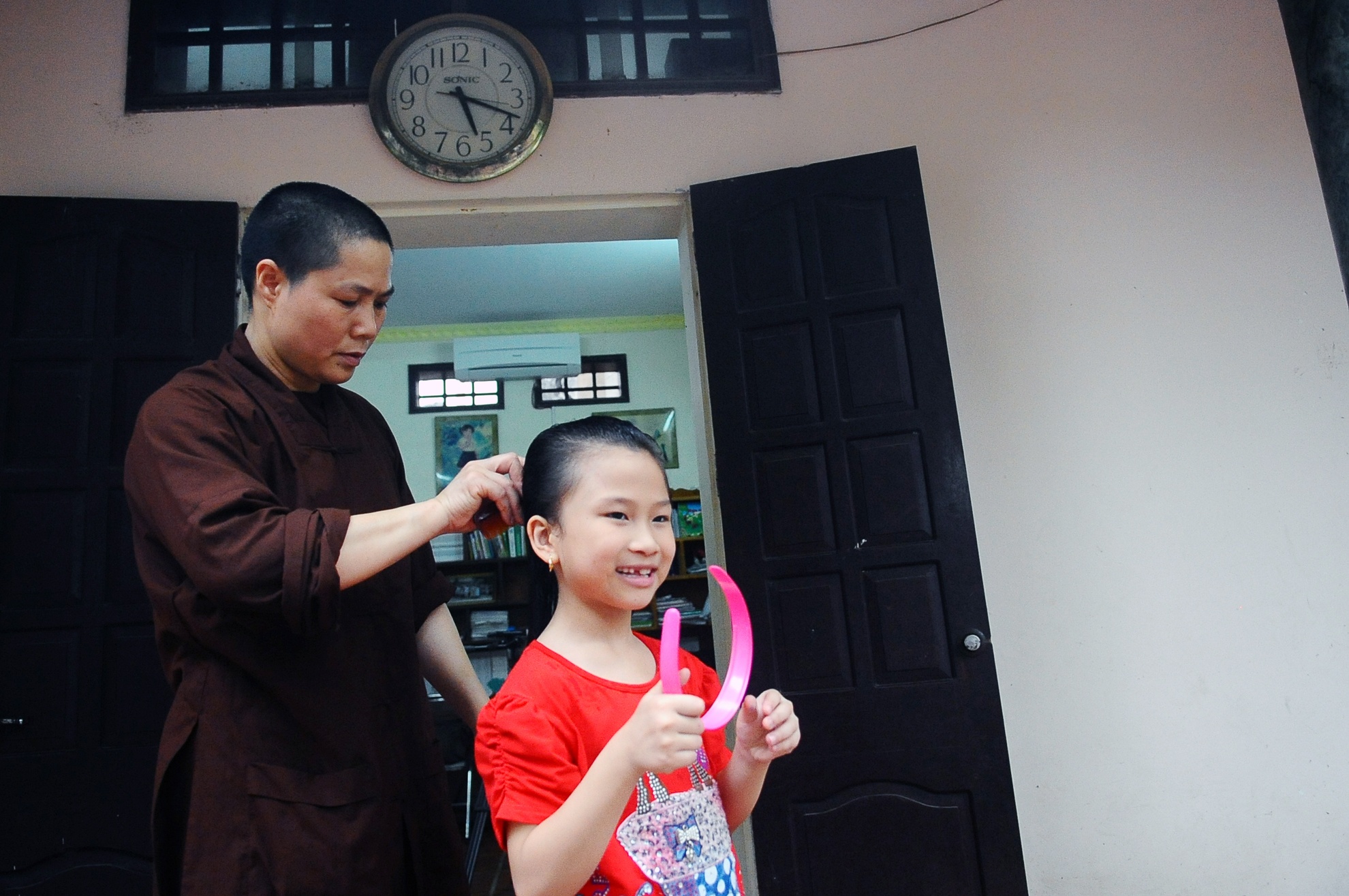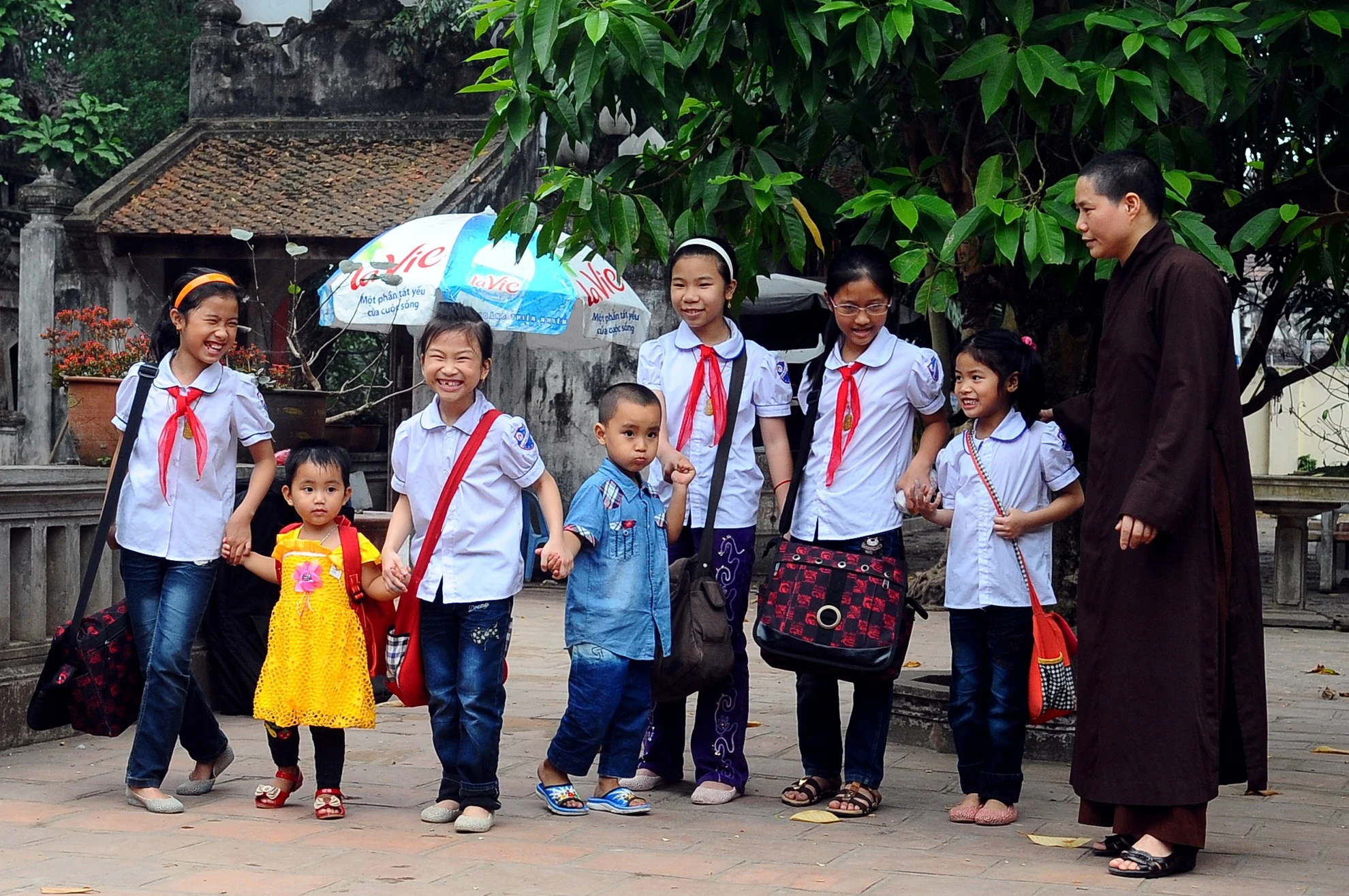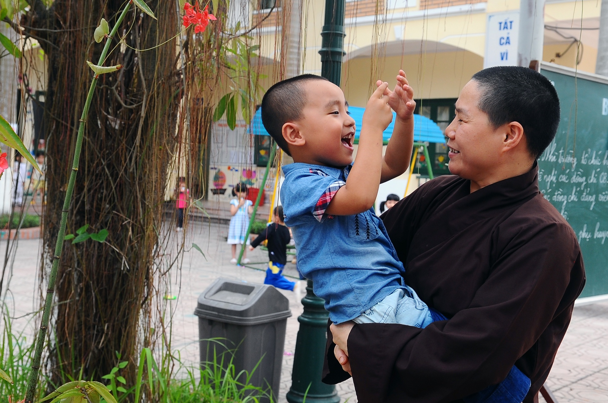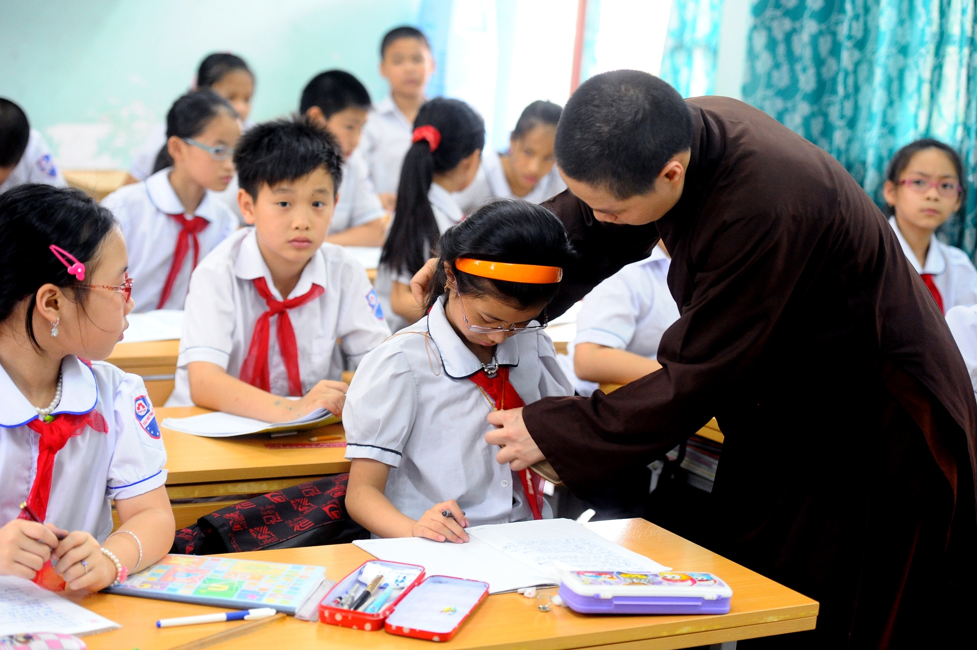 | Các con học ở các trường khác nhau nên thầy hết đón bé này lại sang trường khác để chờ bé khác trong khoảng 1 giờ đồng hồ buổi chiều. Vừa vào đến lớp, thấy bé Bình Nhi bị xộc xệch chiếc khăn đỏ, thầy liền vào hẳn trong lớp chỉnh lại cho ngay ngắn. Các giáo viên và học sinh khác trong trường không lạ lẫm gì với việc chiều chiều có một nhà sư mặc áo nâu sồng đi từ phòng học này sang phòng khác để đón con. |