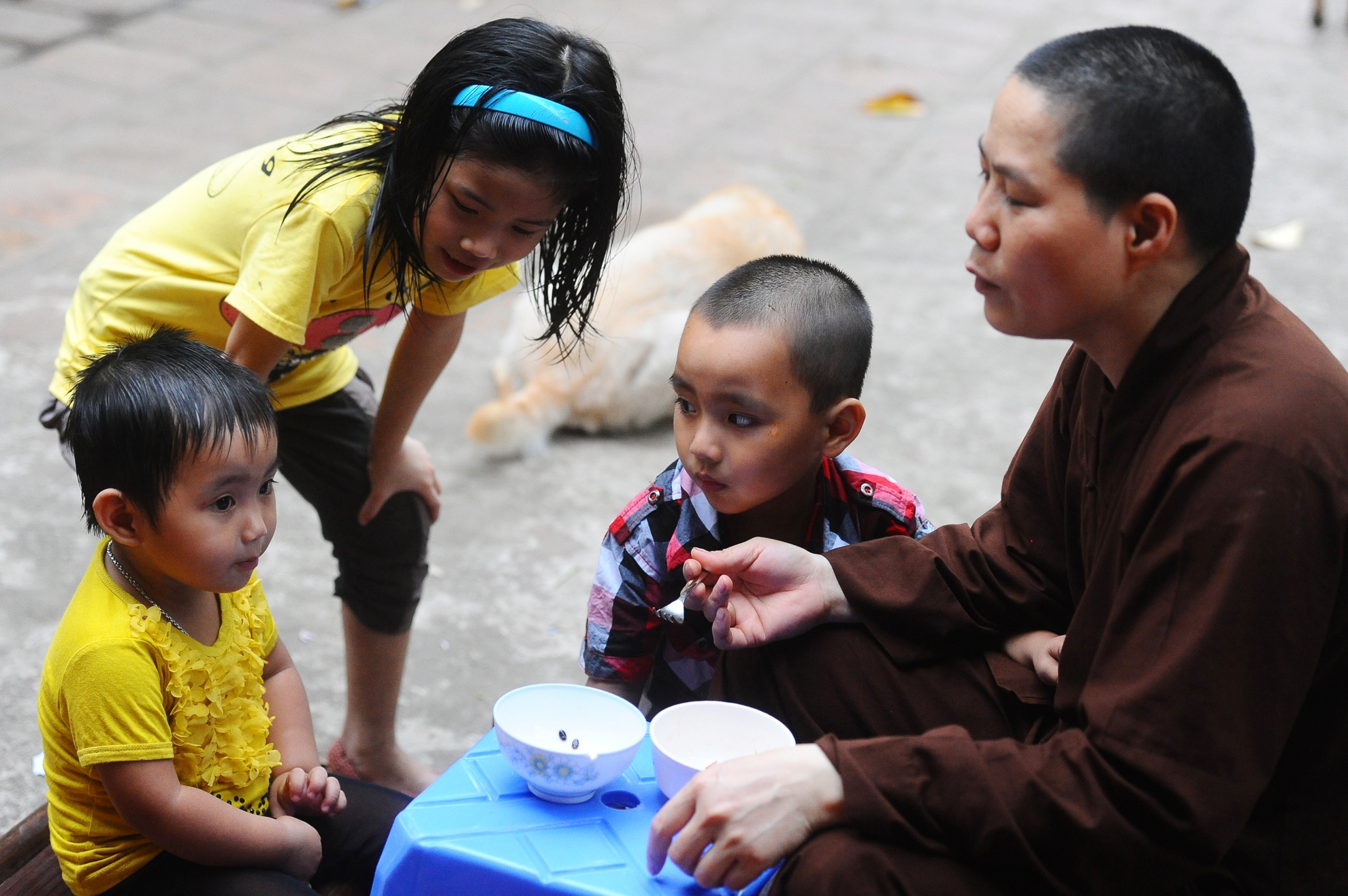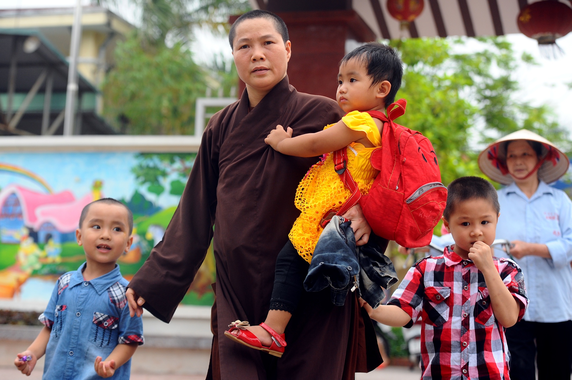 Ni sư Thích Đàm Thanh ở chùa Mía (Hà Nội) nuôi dưỡng 7 cháu bé bị mẹ bỏ rơi tại bệnh viện phụ sản. Cả ngày thầy dành nhiều thời gian chăm sóc đưa đón các em đi học.