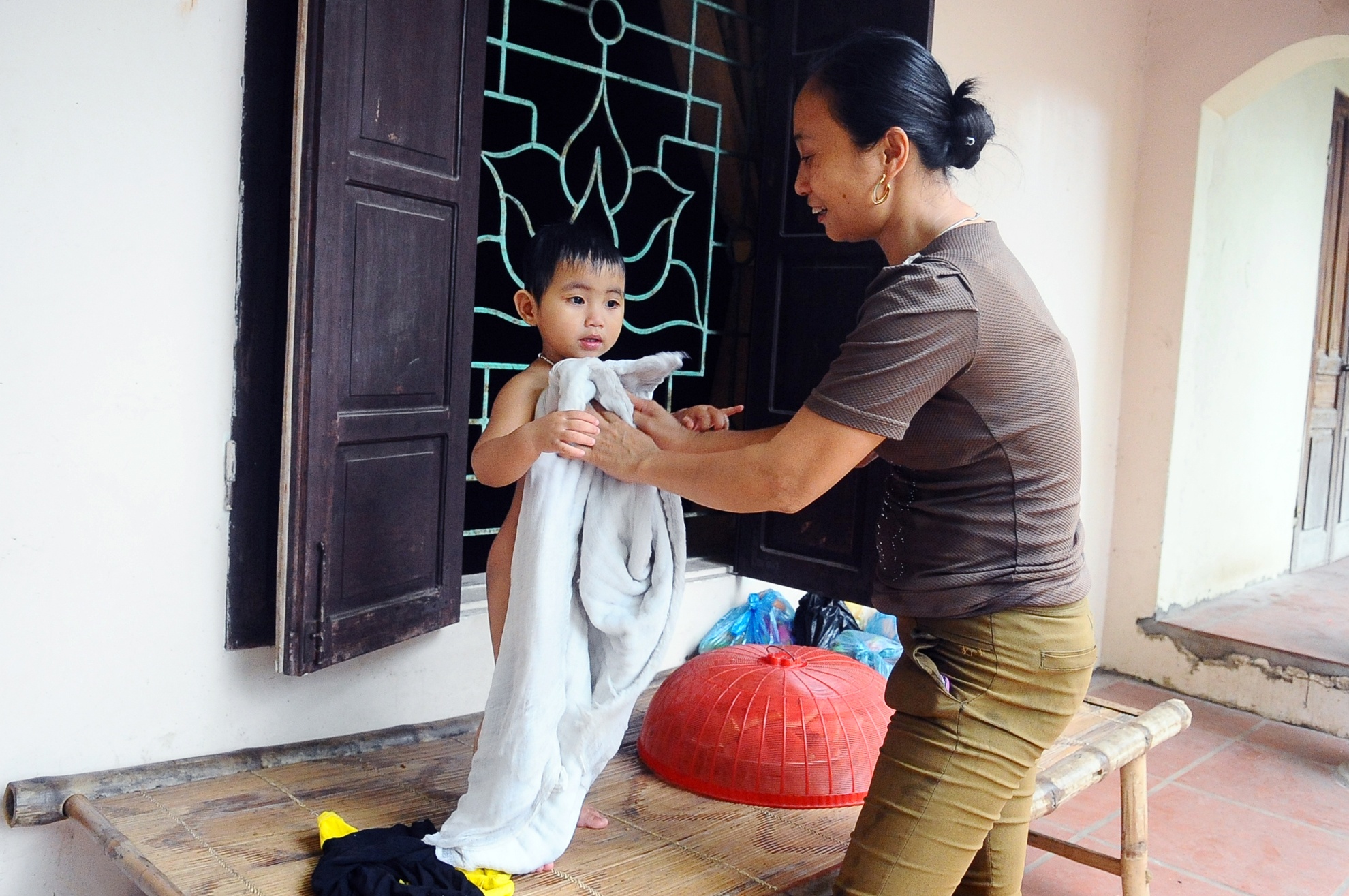 Trong ảnh là chị Thơm, một Phật tử chùa ngày ngày chăm sóc đàn trẻ giúp đỡ thầy. Ngoài chị còn có vài người nữa tình nguyện giúp đỡ các em trong việc tắm rửa, nấu cơm nên cũng bớt vất vả đi nhiều.