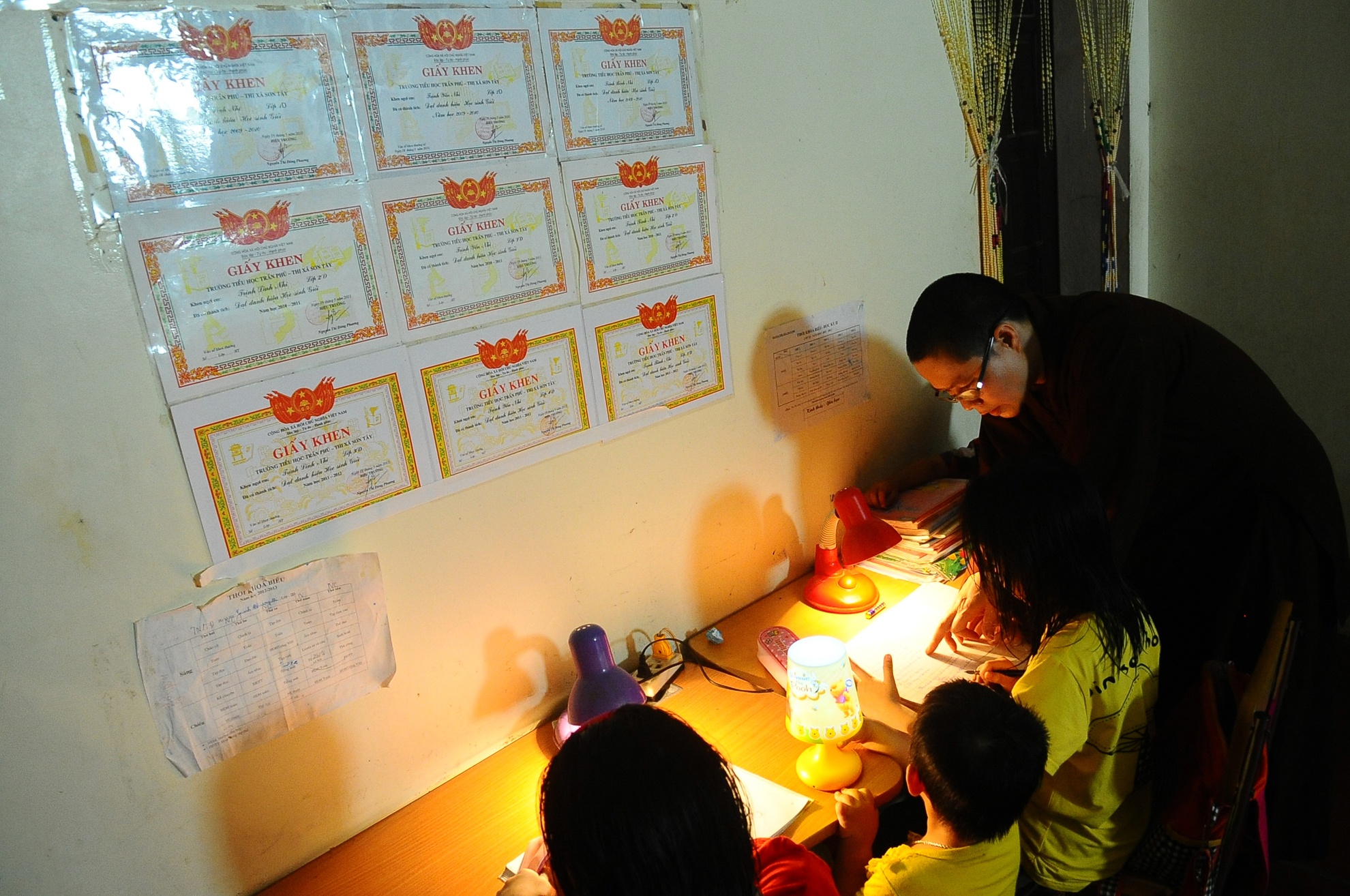 Góc học tập của các bé trong độ tuổi tiểu học tại phòng nhỏ trong chùa. Sau bữa cơm mỗi tối, các con lại ngồi đúng vị trí làm bài tập theo sự chỉ bảo của thầy. Điều xúc động nhất ở thầy là luôn nhắc nhở các em và khuyên răn không nên oán trách mẹ đẻ của mình nếu như gặp lại. Thầy bảo, không người mẹ nào dứt ruột đẻ ra con mà lại nỡ vứt bỏ, chẳng qua vì hoàn cảnh không còn cách nào khác nên mới phải xa lìa con.
