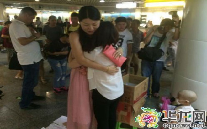 Quá tuyệt vọng, chị Chen quyết định bán những cái ôm của mình tại ga tàu điện. May mắn trong một giờ chị có thể kiếm được khoảng 600 nhân dân tệ.