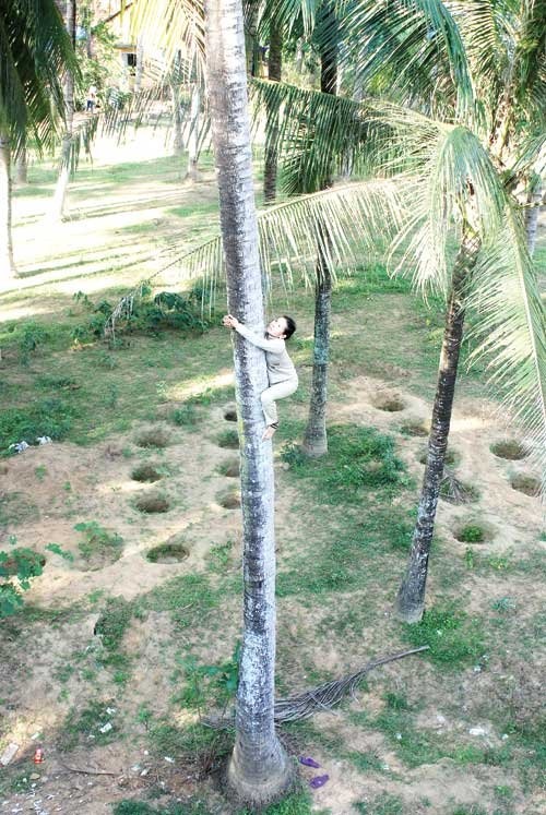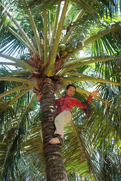 | Chị Thơm cheo leo trên cây dừa. Để chụp được bức ảnh này, tôi phải trèo lên một cây dừa cạnh đó một cách rất vất vả, trong khi mỗi ngày chị trèo khoảng 20 cây. |