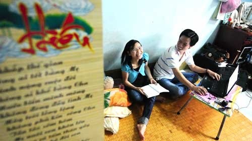 | Hai anh em Nguyễn Văn Thuận và Nguyễn Thị Tiện hiện đang làm việc và học tập tại TP HCM. Trong căn phòng trọ, một bức thư pháp về chữ Hiếu được hai anh em treo trang trọng để nhớ đến công ơn mẹ cha. |