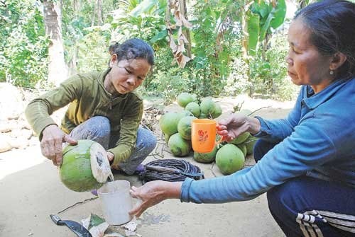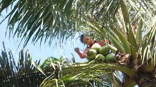 | Là hộ nghèo phải nuôi hai con ăn học, chị Võ Thị Thơm (47 tuổi) hằng ngày trèo hái dừa để kiếm sống. Những buồng dừa nằm chót vót trên cao có khi đến trên 20 m, vậy mà mỗi ngày chị phải trèo từ 15-20 cây, hái hàng chục buồng dừa. Chị hái thuê hoặc mua dừa trên cây rồi hái xuống bán để kiếm lời. |