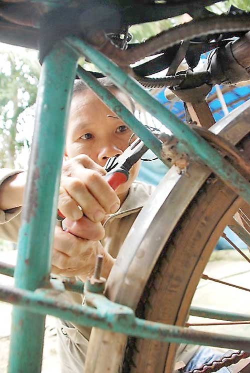 | Chiếc xe đạp cũ kỹ trở chứng, chị ra tay sửa luôn. |