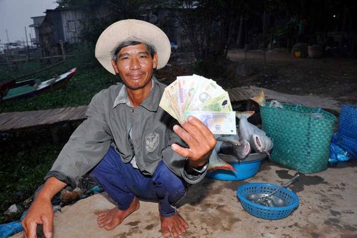 | Ngư dân Nguyễn Văn Buôn bán 2 con cá 12,2kg khoe gần 2 triệu đồng. |