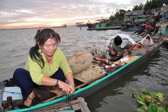 | Đàn ông, phụ nữ cùng chuẩn bị xuồng lưới. |
